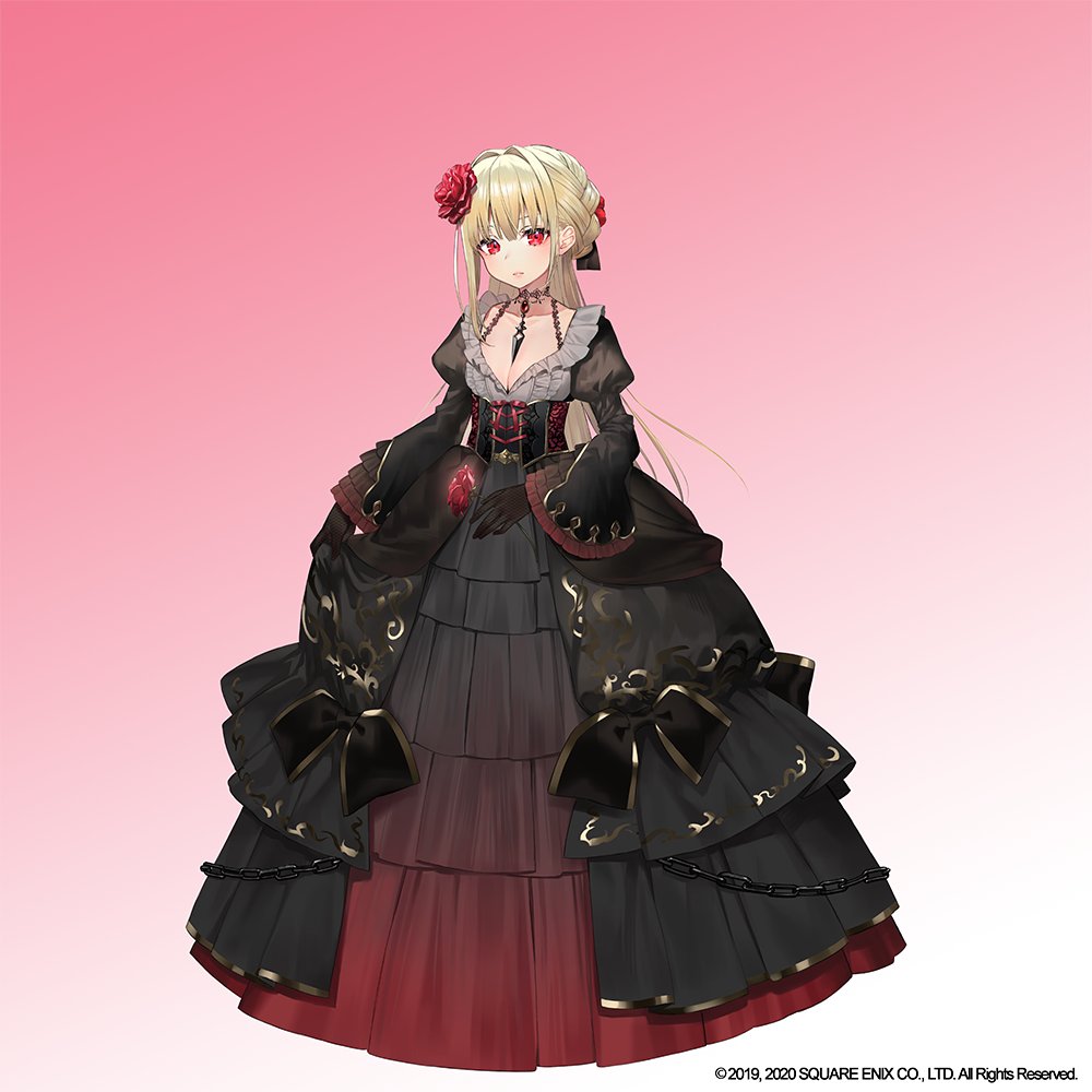 1girl asagi_yuna black_dress black_gloves blonde_hair braid breasts chain copyright_notice dress flower full_body gloves gradient_background grimms_echoes holding holding_flower jewelry la_belle_the_beauty_(grimms_echoes) long_hair official_art pendant pink_background red_eyes red_flower red_rose rose solo