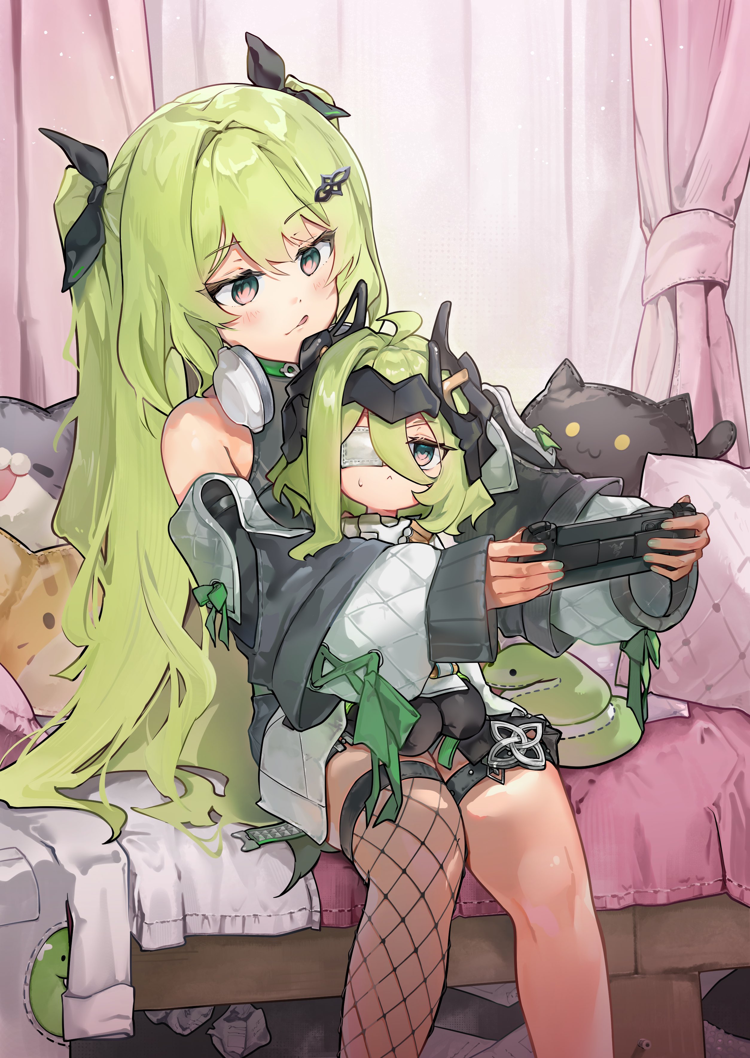 2girls :< absurdres black_ribbon closed_mouth commentary curtains eyepatch feet_out_of_frame fishnet_thighhighs fishnets green_eyes green_hair grey_nails hair_between_eyes hair_ornament hair_ribbon hairclip hanaguruma_(hana96ma) handheld_game_console headphones headphones_around_neck highres holding honkai_(series) honkai_impact_3rd indoors klein_(honkai_impact) long_hair long_sleeves medical_eyepatch mobius_(honkai_impact) mobius_(razer)_(honkai_impact) multiple_girls nail_polish official_alternate_costume pillow puffy_long_sleeves puffy_sleeves ribbon seiza single_thighhigh sitting sitting_on_lap sitting_on_person sleeves_past_wrists stuffed_animal stuffed_cat stuffed_toy thighhighs tongue tongue_out two_side_up very_long_hair
