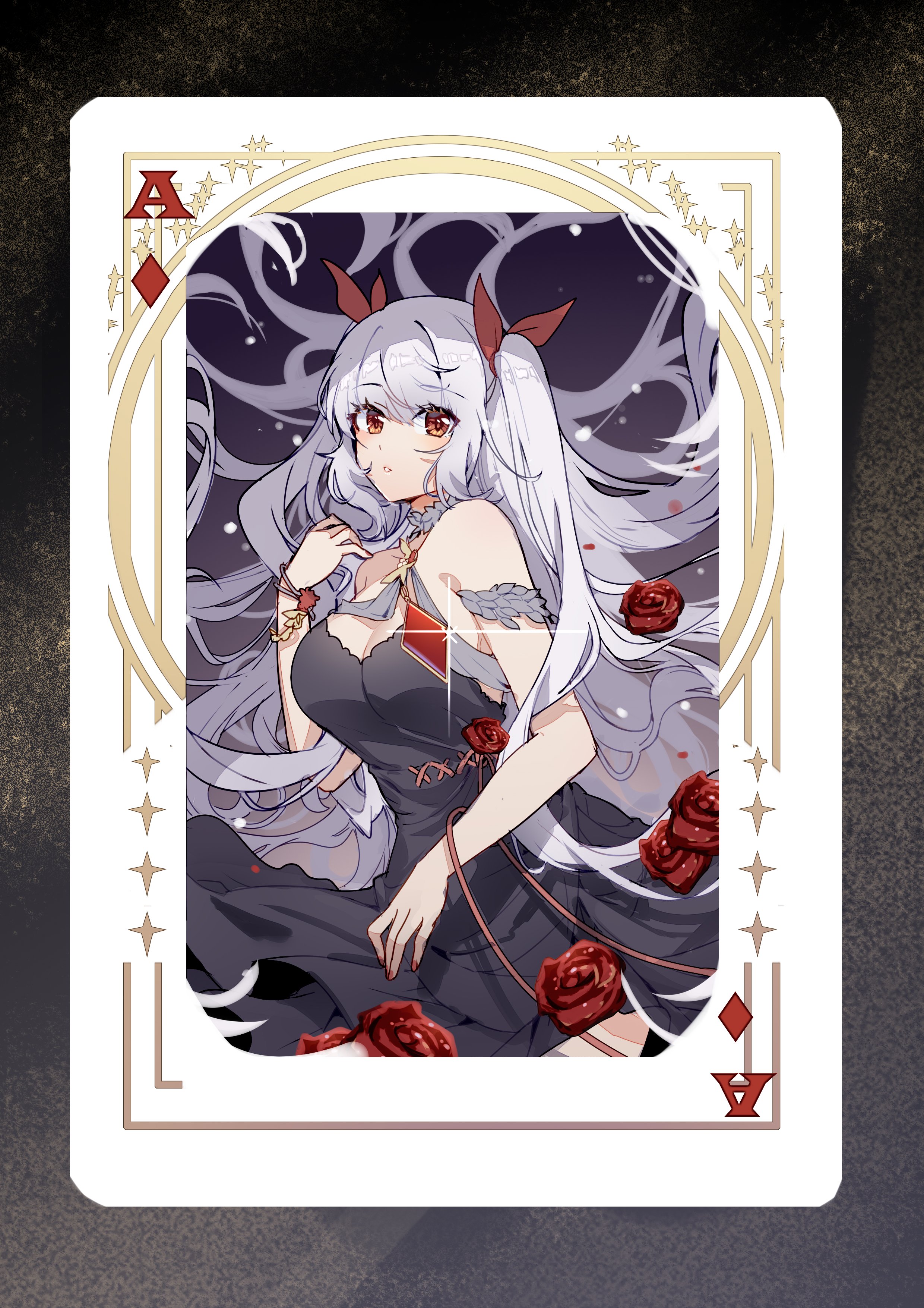 1girl absurdres aer_(tengqiu) bare_shoulders black_dress breasts card cleavage dress essex_(warship_girls_r) flower hair_ribbon highres large_breasts long_hair looking_at_viewer playing_card red_eyes red_flower red_ribbon red_rose ribbon rose solo twintails two_side_up very_long_hair warship_girls_r white_hair