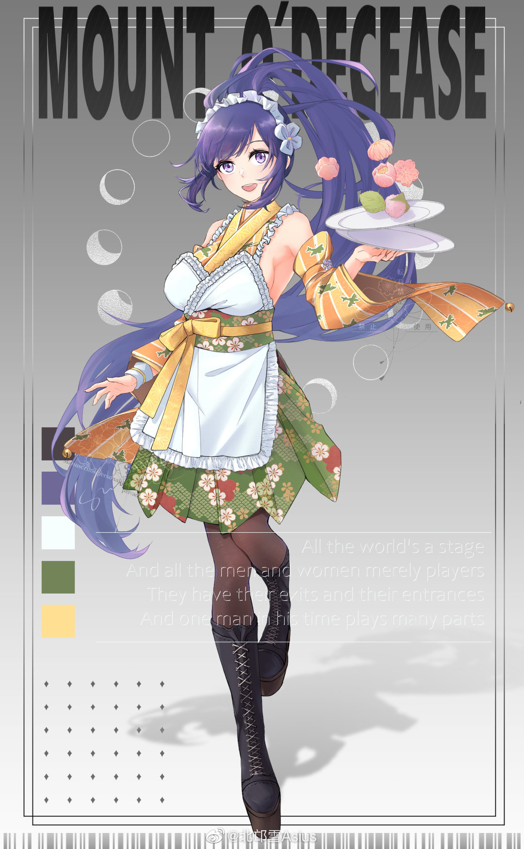 1girl alternate_costume apron beimangxue_asius black_boots boots breasts dango detached_sleeves english_text food full_body highres holding holding_tray japanese_clothes kimono lace-up_boots large_breasts long_hair looking_at_viewer maid maid_headdress open_mouth pantyhose ponytail purple_eyes purple_hair shinano_(warship_girls_r) skirt smile solo tray very_long_hair wa_maid wagashi warship_girls_r watermark weibo_watermark
