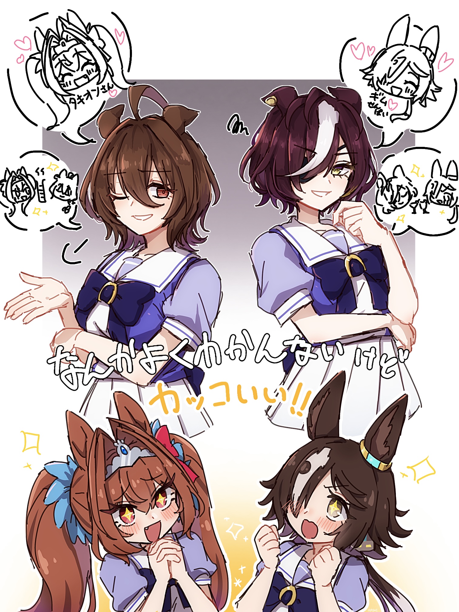 +_+ 4girls agnes_tachyon_(umamusume) animal_ears arguing back_bow blush_stickers bow bowtie brown_eyes brown_hair clenched_hands cocktail cocktail_glass commentary cup daiwa_scarlet_(umamusume) doting_parent drinking_glass ear_ornament ears_back eyepatch fang gradient_background grey_background hair_intakes hair_over_one_eye hide_oo highres horse_ears horse_girl light_brown_hair long_hair low_ponytail medium_hair multiple_girls one_eye_closed outdoors outside_border own_hands_clasped own_hands_together ponytail puff_of_air puffy_short_sleeves puffy_sleeves purple_bow purple_bowtie purple_shirt red_eyes sailor_collar sailor_shirt school_uniform shirt short_hair short_sleeves skirt spoken_character squiggle summer_uniform tanino_gimlet_(umamusume) test_tube tiara tracen_school_uniform translated twintails umamusume umamusume_horse_relations vodka_(umamusume) white_hair white_sailor_collar white_skirt wolf_cut yellow_eyes