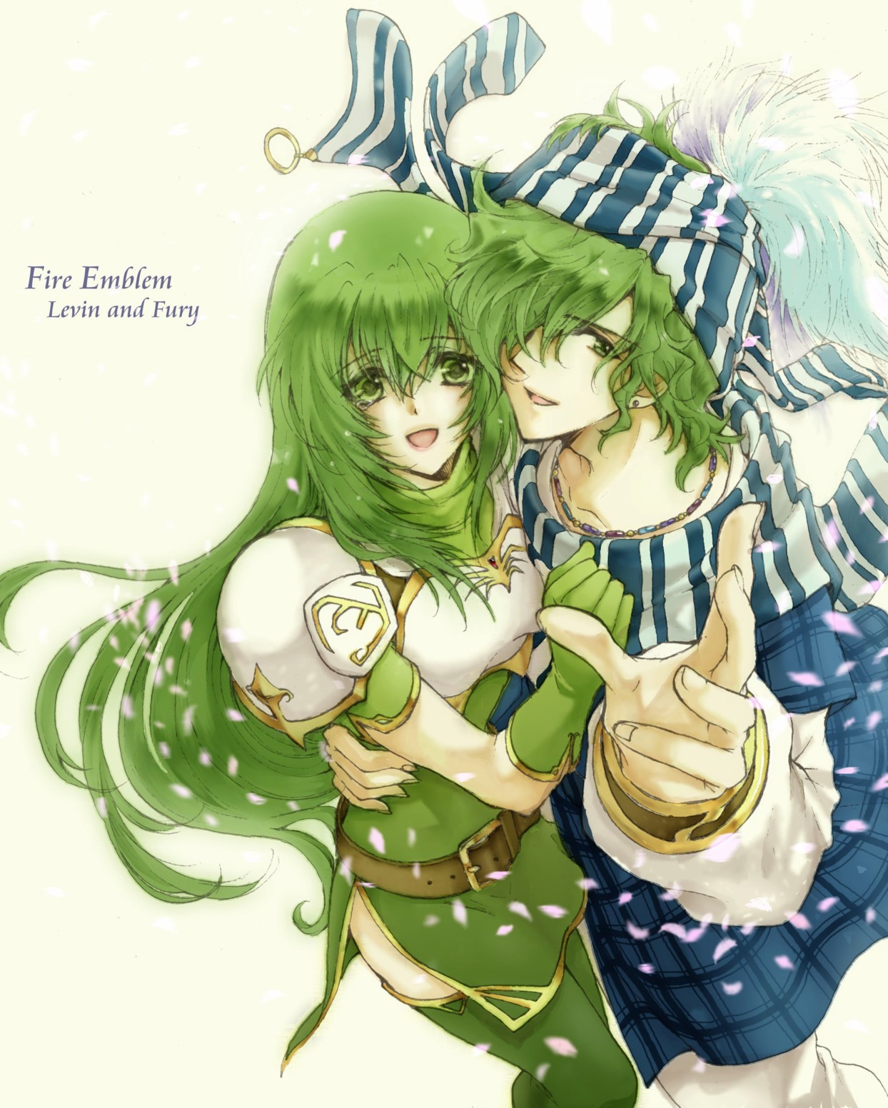 1boy 1girl arm_around_another's_waist armor bead_necklace beads blue_headband blue_headscarf blue_scarf character_name copyright_name couple dress earrings erinys_(fire_emblem) falling_petals fire_emblem fire_emblem:_genealogy_of_the_holy_war from_above gloves gold_trim green_dress green_eyes green_gloves green_hair hair_over_one_eye hand_on_another's_chest hand_on_another's_waist hand_up headband headscarf hetero highres jewelry lewyn_(fire_emblem) long_hair long_sleeves looking_at_viewer looking_up mochineko necklace nintendo open_mouth pauldrons petals pink_petals puffy_long_sleeves puffy_sleeves reaching reaching_towards_viewer scarf short_dress short_hair shoulder_armor simple_background smile striped_clothes striped_scarf stud_earrings two-tone_scarf white_armor white_sleeves