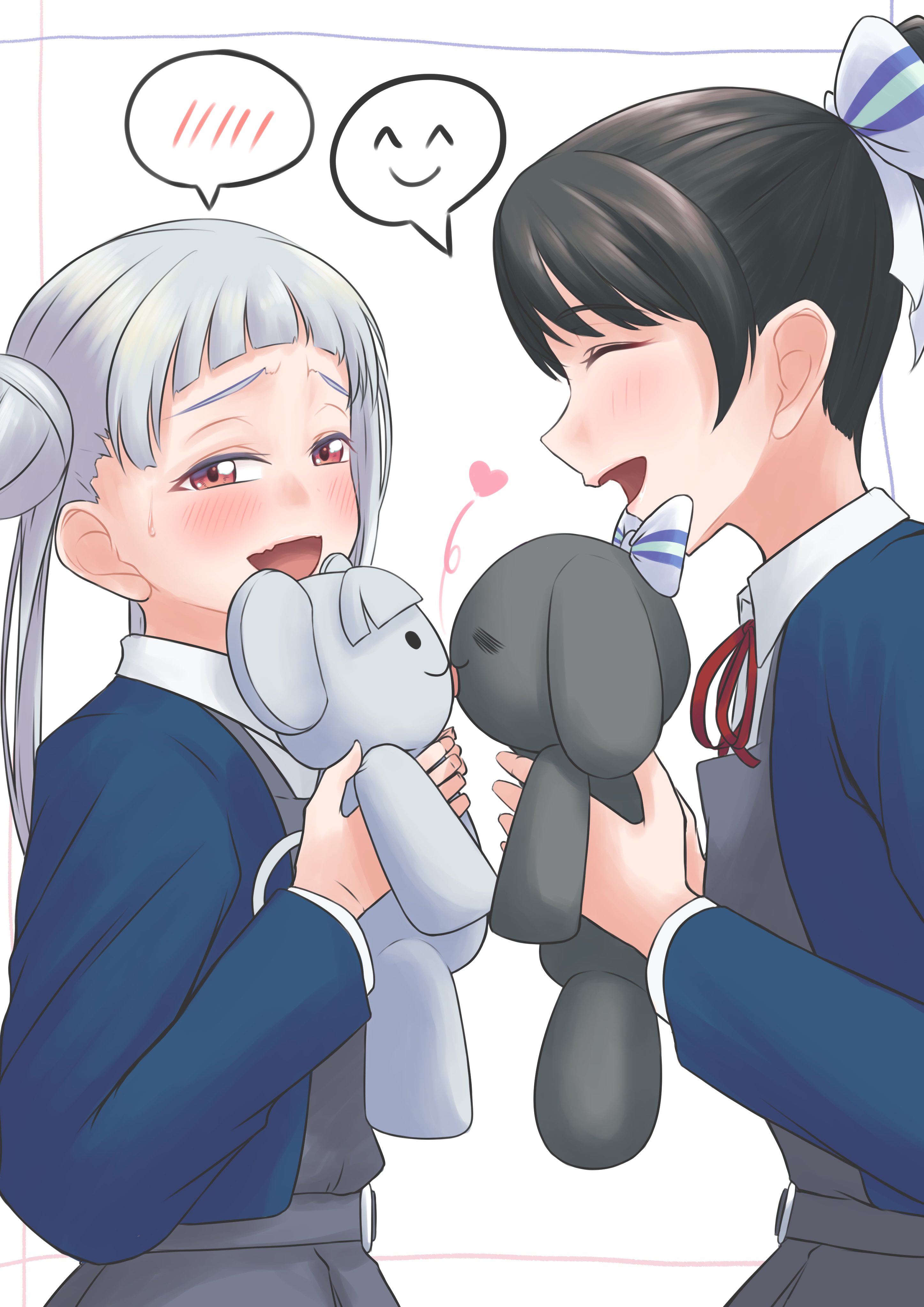 2girls :d ^_^ absurdres arashi_chisato arched_bangs averting_eyes black_hair blue_jacket blush bow character_doll closed_eyes clueless collared_shirt commentary_request dolce_(love_live!) doll dolls_kissing double_bun dress dress_shirt grey_dress grey_hair hair_bow hair_bun hazuki_ren heart high_ponytail highres jacket long_hair long_sleeves love_live! love_live!_superstar!! multiple_girls neck_ribbon nervous_smile open_clothes open_jacket open_mouth ponytail red_eyes red_ribbon ribbon school_uniform shirt simple_background smile spoken_blush spoken_expression stuffed_animal stuffed_toy sweatdrop twintails uduki_fuji upper_body white_background white_bow white_shirt winter_uniform yuigaoka_school_uniform yuri
