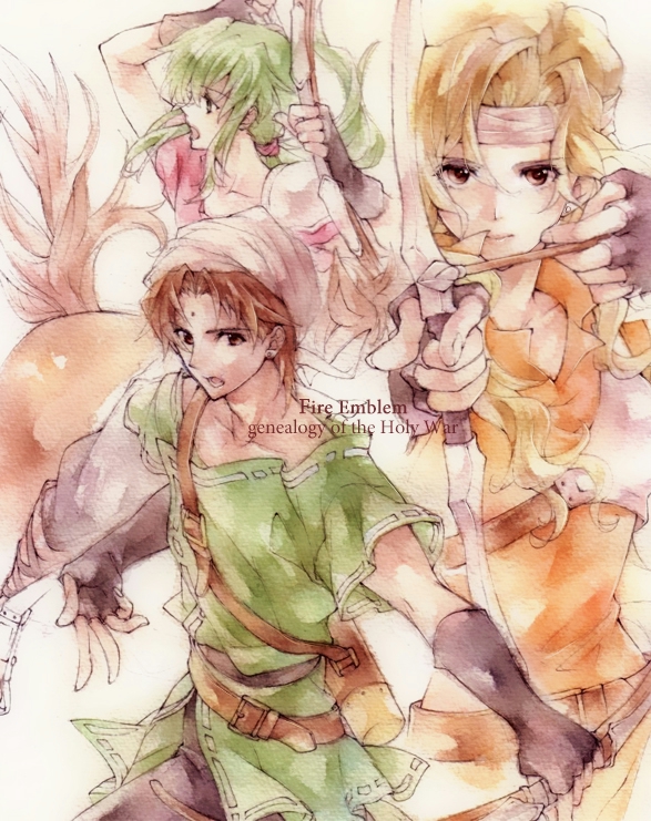 1girl 2boys aiming aiming_at_viewer arrow_(projectile) bandana black_gloves blonde_hair bow_(weapon) brigid_(fire_emblem) brown_eyes chest_guard copyright_name dress facial_mark fingerless_gloves fire_emblem fire_emblem:_genealogy_of_the_holy_war forehead_mark gloves green_hair green_tunic headband holding holding_arrow holding_bow_(weapon) holding_weapon horse jamke_(fire_emblem) low_ponytail midir_(fire_emblem) mochineko multiple_boys nintendo open_mouth orange_dress ponytail profile sandima short_dress short_hair sidelocks sleeveless sleeveless_dress trait_connection tunic weapon white_bandana white_headband