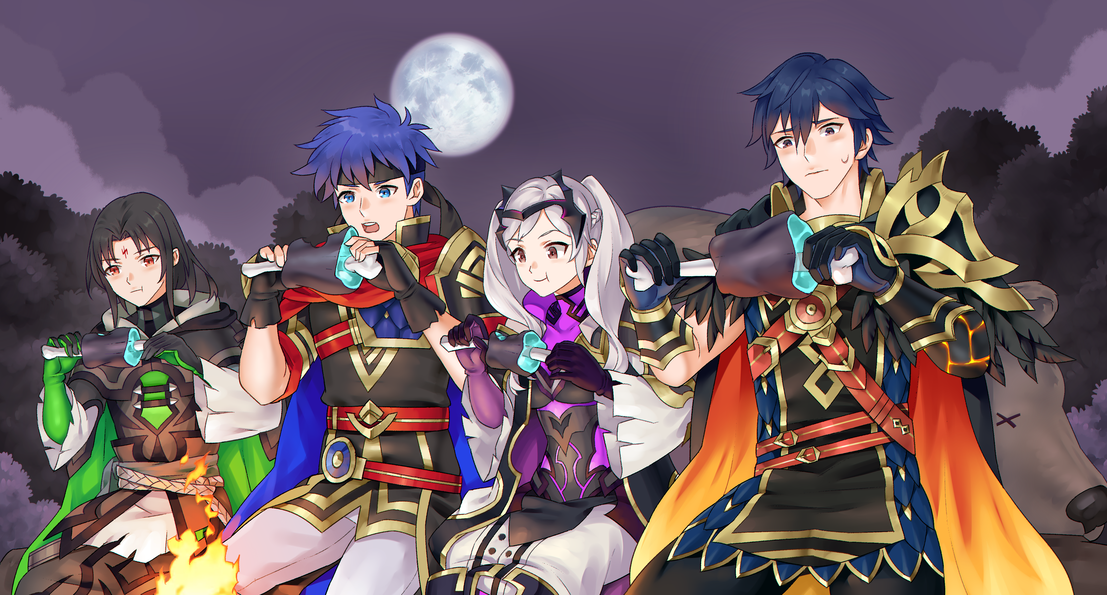 1girl 3boys absurdres armor bear black_hair blue_eyes blue_hair boned_meat cape chrom_(fire_emblem) chrom_(resplendent)_(fire_emblem) eating facial_mark feathered_cape female_robin_(fire_emblem) female_robin_(resplendent)_(fire_emblem) fingerless_gloves fire_emblem fire_emblem:_path_of_radiance fire_emblem_awakening fire_emblem_heroes food forehead_mark full_moon gloves headband highres holding holding_food hood hood_down ike_(fire_emblem) ike_(resplendent)_(fire_emblem) long_hair meat moon multiple_boys night nintendo official_alternate_costume open_mouth outdoors pauldrons red_eyes redkite333 short_hair shoulder_armor single_pauldron sitting sky soren_(fire_emblem) soren_(resplendent)_(fire_emblem) twintails two-sided_cape two-sided_fabric white_hair