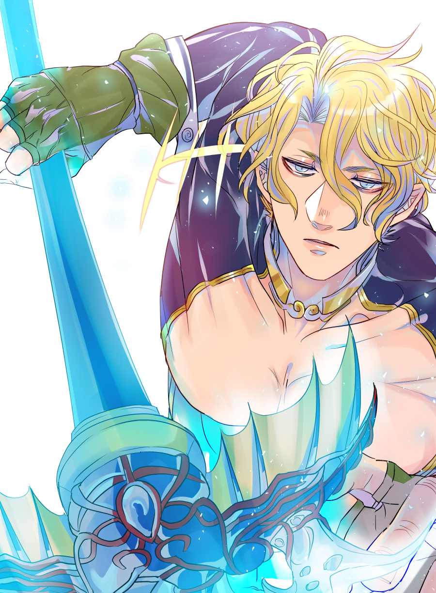 1boy arm_up armlet blonde_hair blue_eyes choker collarbone expressionless fingerless_gloves gloves gold_choker gold_trim golden_armlet green_gloves hair_between_eyes half-closed_eyes highres holding holding_polearm holding_weapon jewelry jitome male_focus muscular muscular_male pectoral_cleavage pectorals pointy_ears polearm poseidon_(shuumatsu_no_valkyrie) revealing_clothes short_hair shuumatsu_no_valkyrie simple_background solo suzuka_(pixiv) tagme toned toned_male trident upper_body weapon