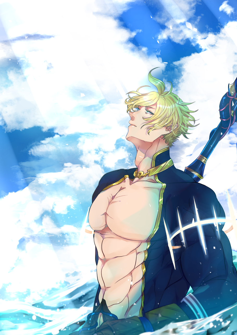 1boy abs armlet blonde_hair blue_eyes choker cloud cloudy_sky collarbone day expressionless facing_to_the_side gloves gold_choker gold_trim golden_armlet green_gloves hair_between_eyes half-closed_eyes highres jewelry jitome looking_up male_focus muscular muscular_male partially_submerged pectoral_cleavage pectorals pointy_ears poseidon_(shuumatsu_no_valkyrie) revealing_clothes short_hair shuumatsu_no_valkyrie sky solo suzuka_(pixiv) tagme toned toned_male upper_body water