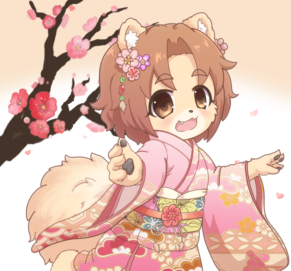 1girl :3 animal_ears animal_hands animal_nose brown_eyes brown_hair commentary_request dog_ears dog_girl dog_tail fang floral_print flower furry furry_female hair_flower hair_ornament japanese_clothes kimono looking_at_viewer obi open_mouth original outdoors pawpads pink_kimono pomeranian_(dog) print_kimono sash short_hair solo tail tree wide_sleeves yude_unagi
