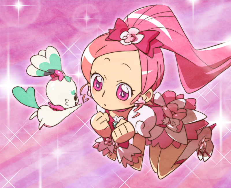 10s 1girl animal_ears boots bow brooch chypre_(precure) creature cure_blossom dress earrings female_focus flower full_body hair_flower hair_ornament hair_ribbon hanasaki_tsubomi heart heart_brooch heartcatch_precure! high_heels high_ponytail jewelry knee_boots kneeling long_hair magical_girl mascot pink_bow pink_eyes pink_hair pink_theme ponytail precure ribbon rim1010 shoes smile solo sparkle tail wrist_cuffs