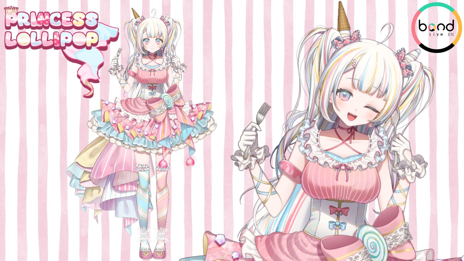 1girl ;d ahoge asymmetrical_legwear blonde_hair blue_bow blue_eyes blue_hair blue_thighhighs bond_en bow breasts commentary copyright_name corset dress english_commentary fork frilled_thighhighs frills full_body gloves gradient_eyes hair_bow heart heart_in_eye highres holding holding_fork holding_spoon multicolored_eyes multicolored_hair multiple_views official_art one_eye_closed open_mouth pink_bow pink_eyes pink_hair pink_shoes pink_thighhighs princess_lollipop sannai_irito second-party_source shoes smile spoon standing streaked_hair striped_background striped_bow symbol_in_eye teeth thighhighs tongue upper_teeth_only virtual_youtuber white_corset white_gloves white_hair