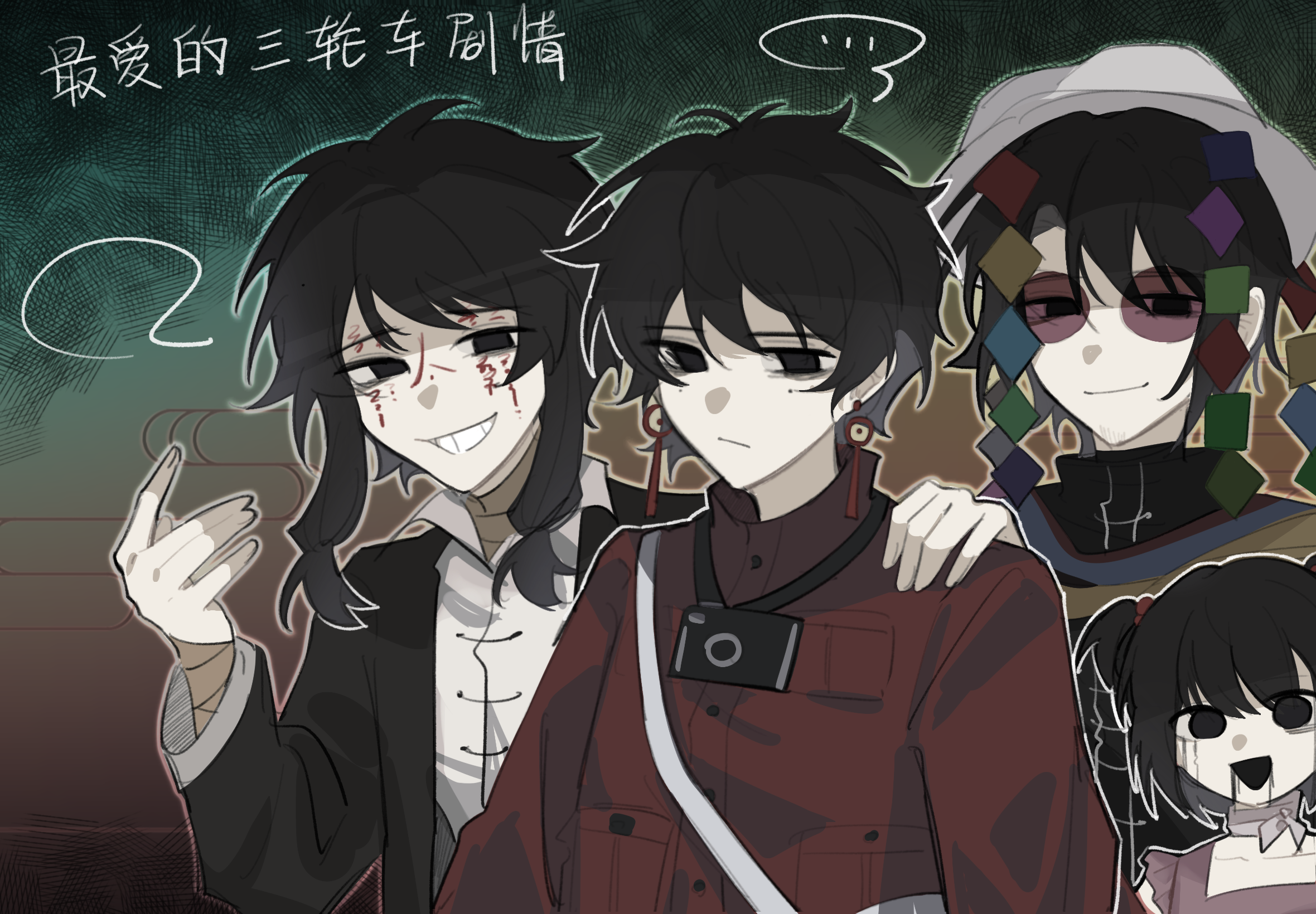 1girl 3boys black_eyes black_hair black_jacket camera camera_around_neck chifanbot0727 chinese_commentary chinese_text closed_mouth collared_shirt commentary_request earrings grin hair_bobbles hair_ornament hand_on_another's_shoulder hand_up hat highres huai_huizhi huai_yunqing jacket jewelry li_yuting_(male) long_sleeves mole mole_under_each_eye mole_under_eye multiple_boys multiple_moles open_clothes open_jacket open_mouth red-tinted_eyewear red_jacket round_eyewear shirt short_hair short_hair_with_long_locks short_twintails smile tinted_eyewear touqi_guaitan translation_request twintails white_hat white_shirt ziche_fuzhao