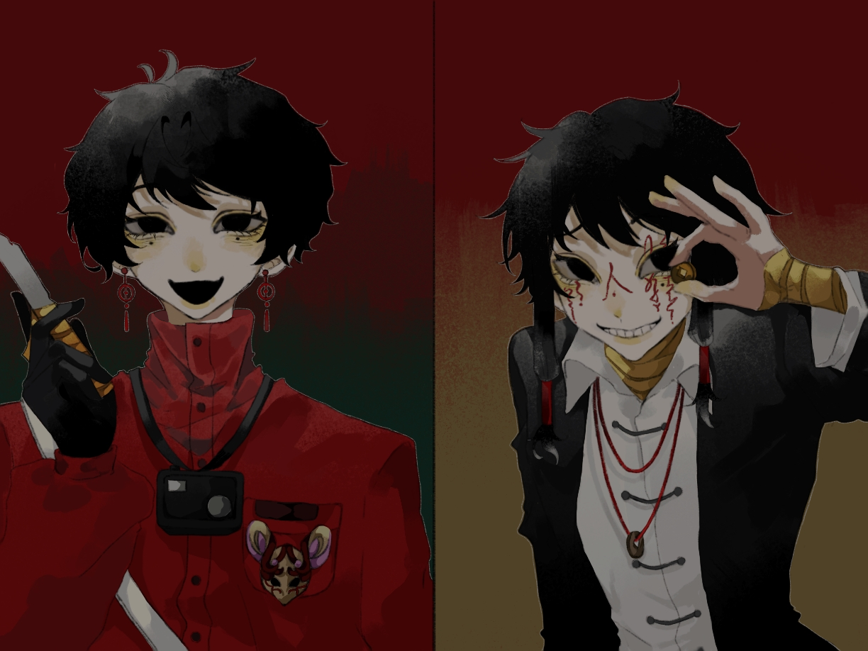 2boys black_eyes black_gloves black_hair black_jacket camera camera_around_neck chenqimiddotliweiqishi chinese_commentary coin coin_on_string collared_shirt commentary_request facepaint gloves grin high_collar holding holding_coin holding_knife holed_coin jacket knife li_yuting_(male) long_sleeves male_focus mole mole_under_each_eye mole_under_eye multiple_boys multiple_moles open_clothes open_jacket open_mouth red_jacket shirt short_hair short_hair_with_long_locks smile touqi_guaitan upper_body white_shirt ziche_fuzhao