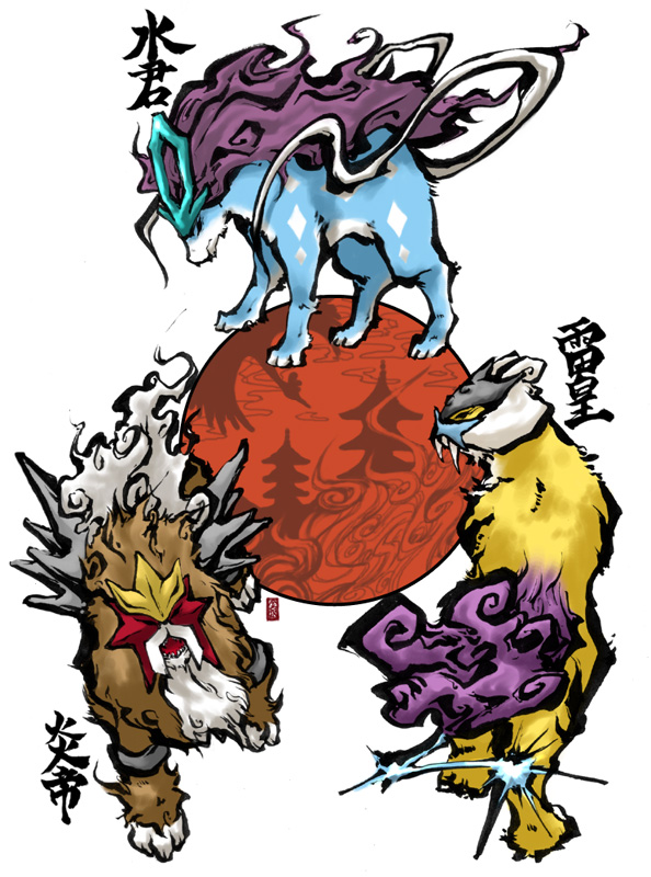 black_eyes entei fangs fuchi. full_body gen_2_pokemon legendary_pokemon nintendo no_humans ookami_(game) open_mouth parody pokemon pokemon_(creature) purple_hair raikou ribbon standing style_parody suicune teeth white_background