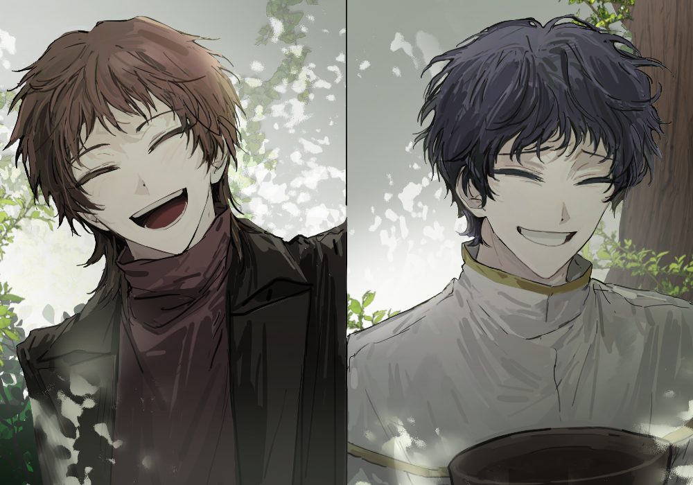 2boys black_hair black_jacket brown_hair brown_sweater capelet closed_eyes colored_eyelashes commentary_request gold_trim grin harada_minoru jacket korean_commentary leviathan_(50eqt1) male_focus multiple_boys open_clothes open_jacket open_mouth outdoors saibou_shinkyoku shirt short_hair smile sweater turtleneck turtleneck_sweater white_capelet white_shirt