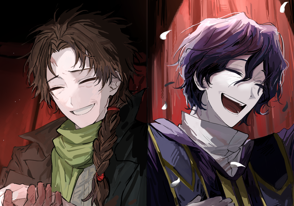 2boys black_jacket braid brown_hair closed_eyes commentary_request gold_trim green_scarf grey_shirt grin hair_between_eyes harada_minoru jacket korean_commentary leviathan_(50eqt1) male_focus multiple_boys open_clothes open_jacket open_mouth pale_skin purple_hair purple_jacket saibou_shinkyoku scar scar_on_face scar_on_forehead scarf shirt short_hair side_braid single_braid smile spotlight stole white_shirt