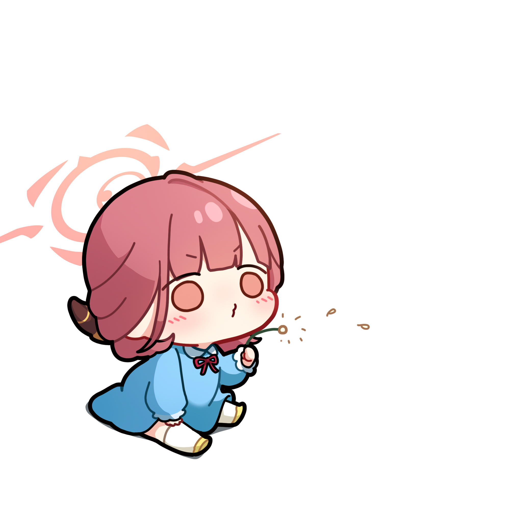 1girl aru_(blue_archive) blowing blue_archive blue_dress blunt_bangs blush chibi dandelion dress flower halo highres holding holding_flower horns kindergarten_uniform kneehighs long_sleeves looking_ahead medium_hair neck_ribbon no_nose pink_eyes pink_hair pink_halo puffy_long_sleeves puffy_sleeves red_ribbon ribbon shoes sitting socks solo uz_(uzru0428) v-shaped_eyebrows white_socks yellow_shoes