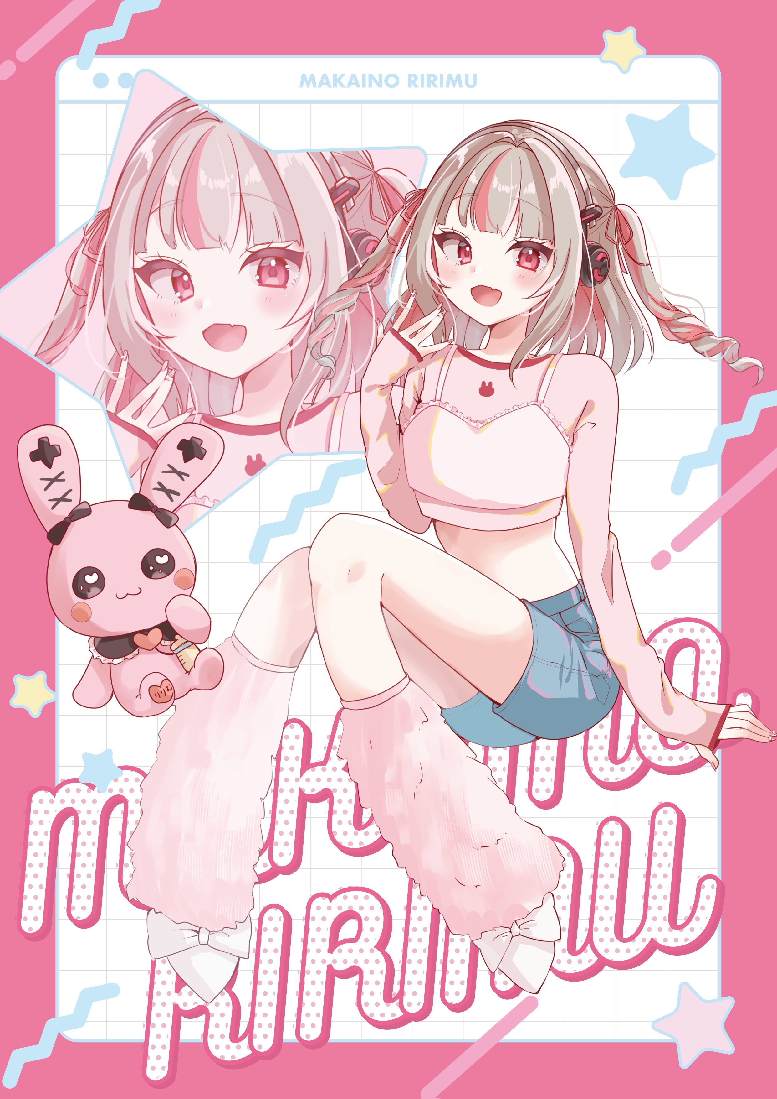 1girl absurdres amaou_(rin_0107) blunt_bangs bow character_name crop_top denim denim_shorts doll drill_hair footwear_bow full_body grey_hair hair_intakes headphones highres leg_warmers long_sleeves looking_at_viewer makaino_ririmu medium_hair midriff multicolored_hair nail_polish nijisanji open_mouth pink_eyes shorts sitting sleeves_past_wrists solo streaked_hair twin_drills two_side_up virtual_youtuber white_footwear zoom_layer