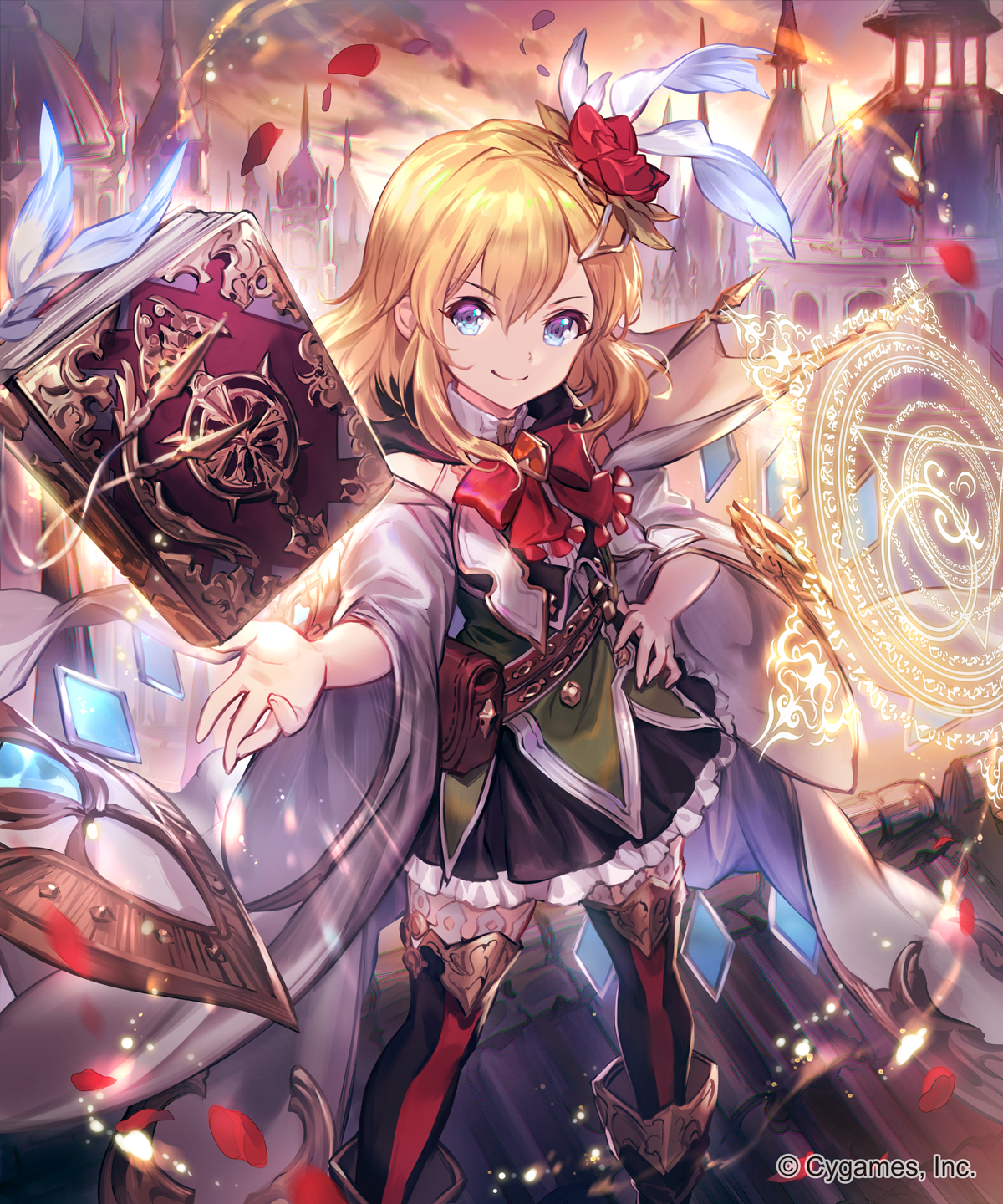 1girl black_boots black_skirt black_thighhighs blonde_hair blue_eyes book boots bow closed_mouth coat commentary_request company_name eleanor_(shadowverse) falling_petals feet_out_of_frame flat_chest floating floating_object flower frilled_skirt frills from_above green_shirt hair_between_eyes hair_flower hair_ornament hand_on_own_hip hand_up highres jewelry lee_hyeseung looking_at_viewer magic magic_circle medium_hair miniskirt multicolored_clothes official_art outdoors petals pleated_skirt pouch red_bow red_flower rooftop shadowverse shirt skirt smile solo standing sunset thighhighs white_coat wide_sleeves