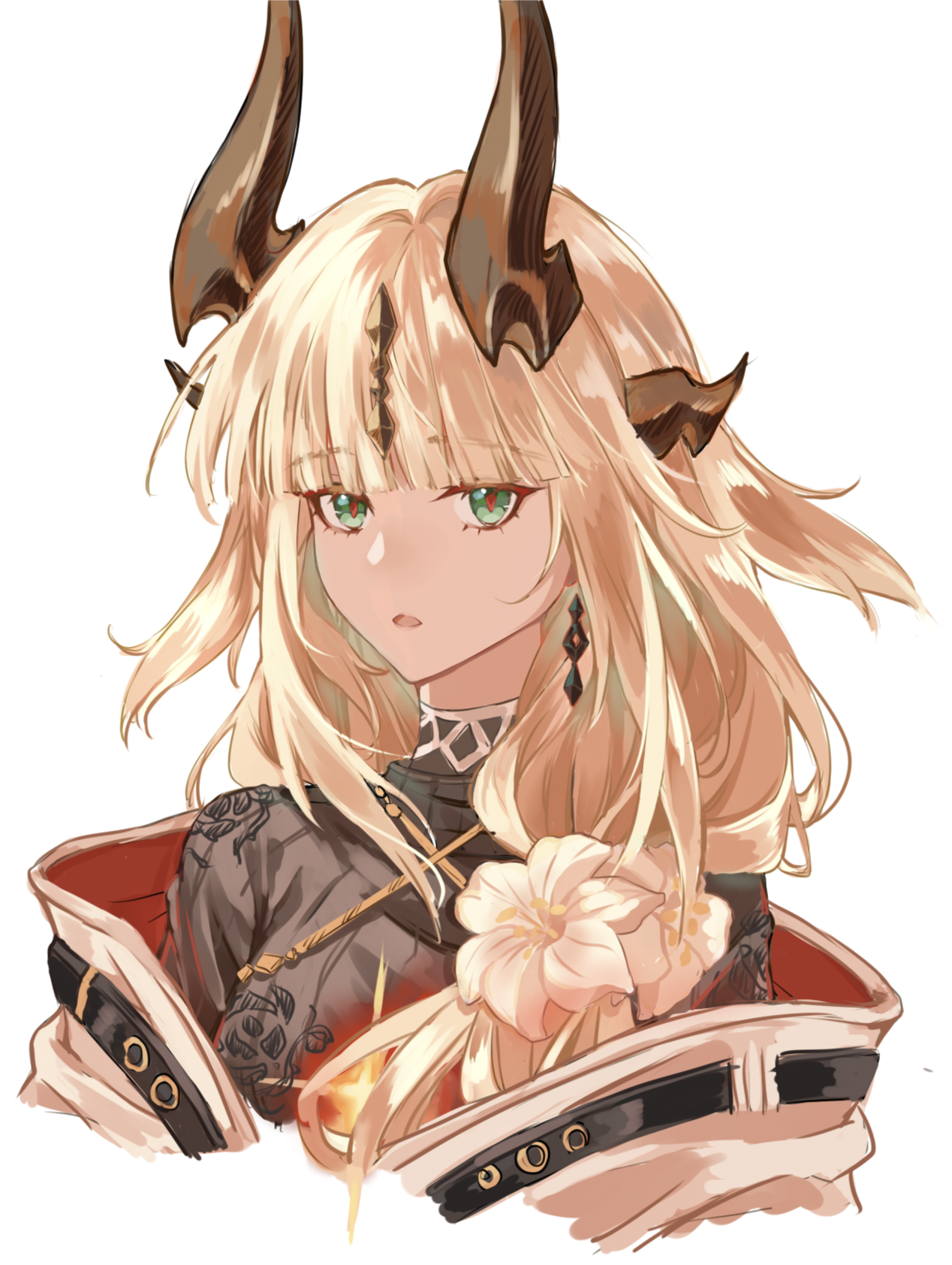 1girl arknights black_sweater blonde_hair blunt_bangs brown_horns chinese_commentary commentary_request cropped_shoulders flower green_eyes hair_flower hair_ornament highres horns long_hair looking_at_viewer official_alternate_costume open_mouth red_pupils reed_(arknights) reed_the_flame_shadow_(arknights) simple_background solo sweater white_background white_flower yuansuiyi