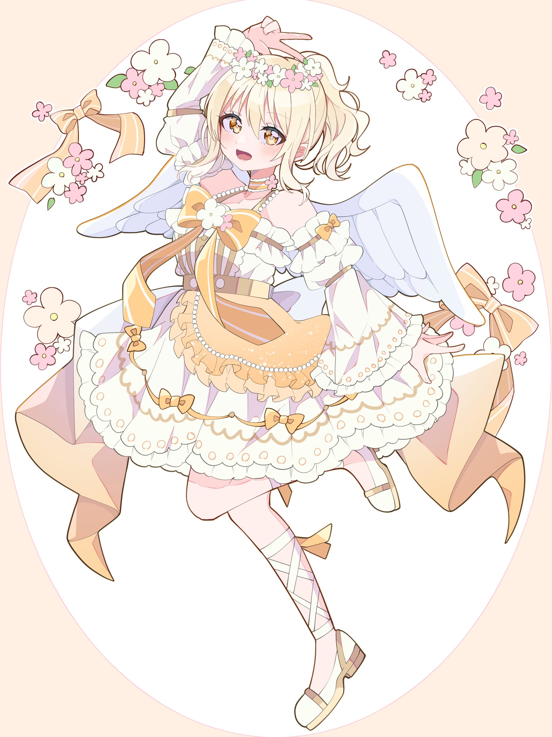 1girl absurdres angel_wings arm_up blonde_hair border bow collarbone commentary_request detached_sleeves dress dress_bow floral_background flower_symbol flower_wreath frilled_dress frilled_sleeves frills full_body head_wreath high_ponytail highres kam_tuki leg_up long_sleeves love_live! love_live!_nijigasaki_high_school_idol_club medium_dress medium_hair miyashita_ai official_alternate_costume open_hand orange_border orange_bow orange_dress orange_eyes oval_border ponytail round_border sidelocks simple_background sleeveless sleeveless_dress solo w white_background white_dress white_footwear white_sleeves white_wings wide_sleeves wings