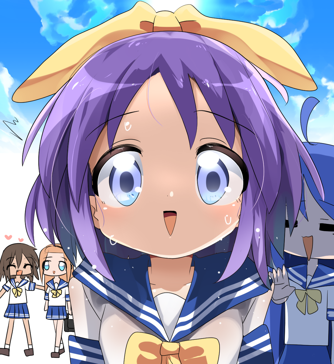 4girls ahoge blue_eyes blue_hair blue_sailor_collar blue_skirt blue_sky blush bow bowtie brown_hair closed_eyes cloud commentary_request hair_bow highres hiiragi_tsukasa izumi_konata kusakabe_misao lets0020 looking_at_viewer lucky_star minegishi_ayano multiple_girls open_mouth purple_hair sailor_collar school_uniform serafuku shirt short_hair skirt sky smile solo_focus sweat upper_body white_shirt yellow_bow yellow_bowtie