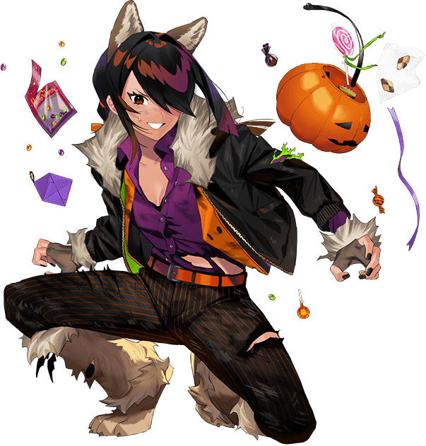 1girl animal_ears black_jacket black_pants boots dark-skinned_female dark_skin fingerless_gloves formal_clothes full_body fur_boots gloves grey_gloves grey_necktie halloween_bucket jack-o'-lantern jacket kantai_collection kumano_maru_(halloween)_(kancolle) kumano_maru_(halloween_mode)_(kancolle) kumano_maru_(kancolle) necktie official_alternate_costume official_art pants purple_shirt shirt smile solo squatting suit third-party_source torn_clothes transparent_background umihara_sakana wolf_ears