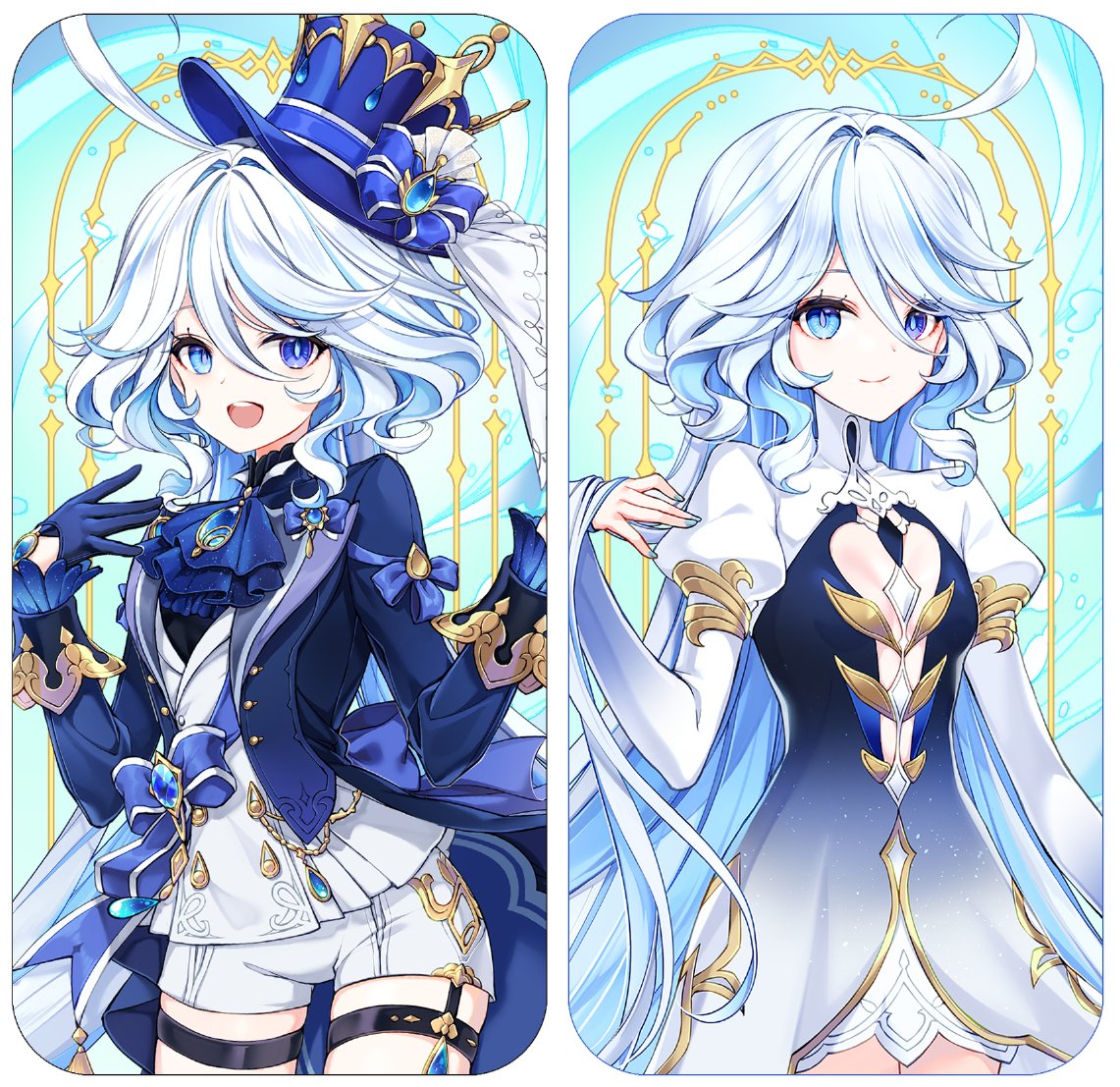 2girls ahoge ascot blue_ascot blue_bow blue_dress blue_eyes blue_gem blue_gloves blue_hair blue_hat blue_jacket blue_nails blue_pupils blue_ribbon bow commentary_request cowboy_shot dress drop-shaped_pupils fingernails focalors_(genshin_impact) furina_(genshin_impact) gem genshin_impact gloves gradient_clothes gradient_dress hair_between_eyes hat hat_bow hat_ribbon hetero jacket juna korean_commentary light_blue_hair long_hair long_sleeves looking_at_viewer multicolored_hair multiple_girls nail_polish open_mouth ouji_fashion ribbon shorts streaked_hair symbol-shaped_pupils teeth thigh_strap upper_teeth_only very_long_hair white_dress white_hair white_shorts