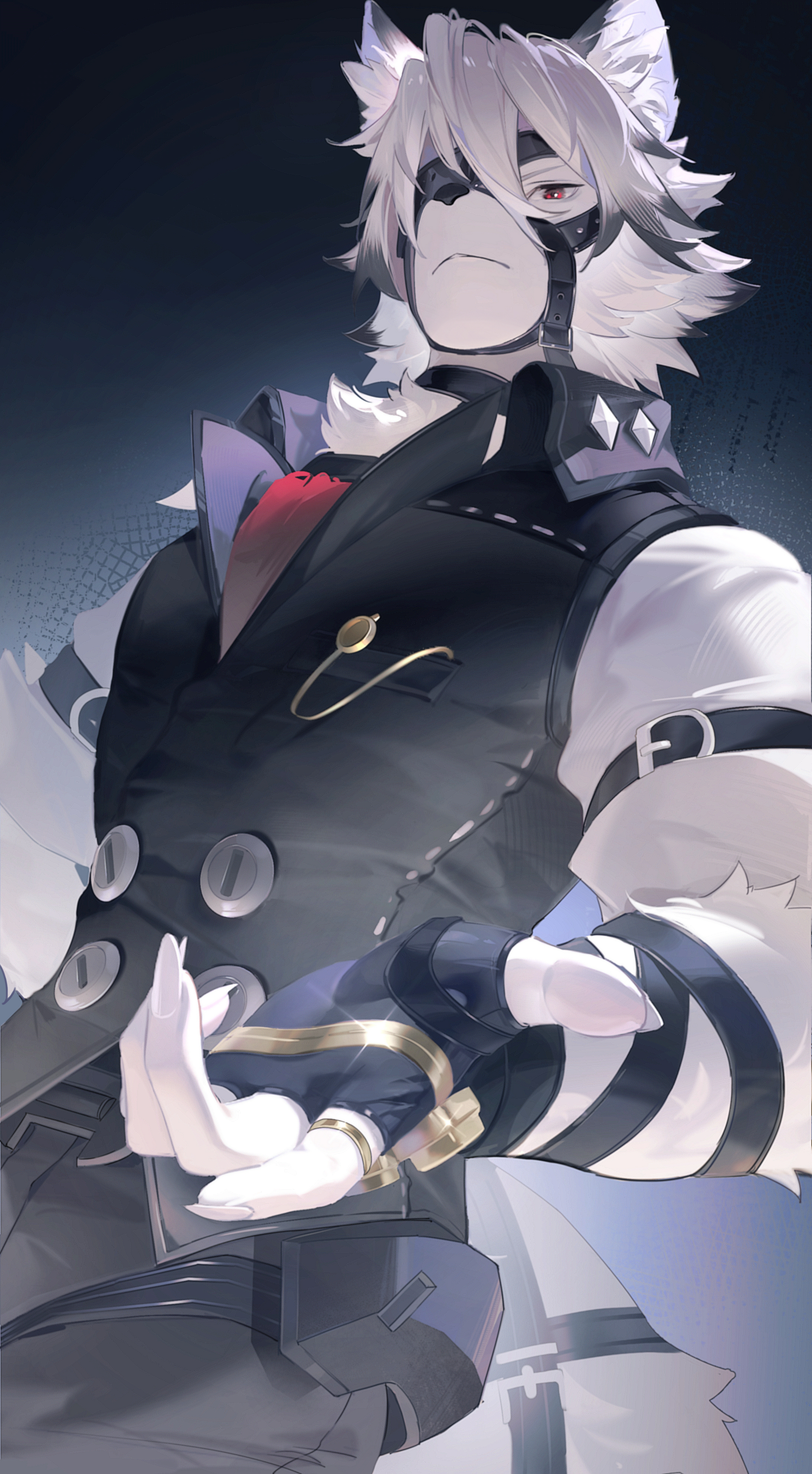 1boy absurdres animal_ears arm_belt black_gloves black_pants black_vest closed_mouth collared_vest colored_tips commentary_request cowboy_shot fingerless_gloves furry furry_male gloves highres jewelry looking_at_viewer male_focus multicolored_hair multiple_rings muzzle_(mask) pants reaching reaching_towards_viewer red_eyes ring shimian_ju shirt sleeves_rolled_up solo tail tail_belt vest von_lycaon white_fur white_shirt wolf_boy wolf_ears wolf_tail zenless_zone_zero