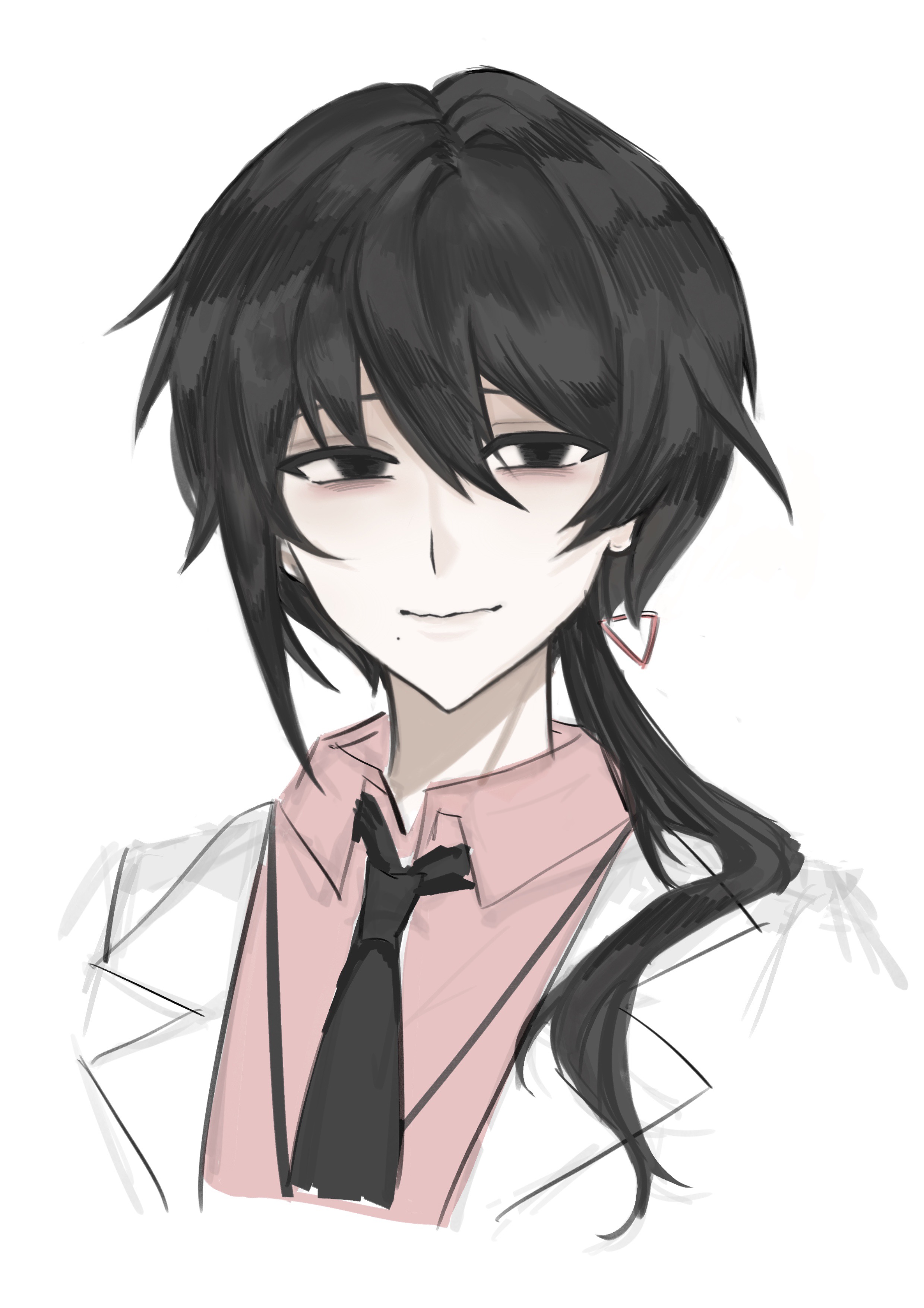 1boy absurdres ajie0708 black_eyes black_hair black_necktie chinese_commentary closed_mouth collared_shirt commentary_request cropped_shoulders hair_between_eyes hair_over_shoulder highres jacket lapels long_hair male_focus mo_chengwei mole mole_under_mouth necktie notched_lapels open_clothes open_jacket pink_shirt shirt simple_background smile solo touqi_guaitan white_background white_jacket