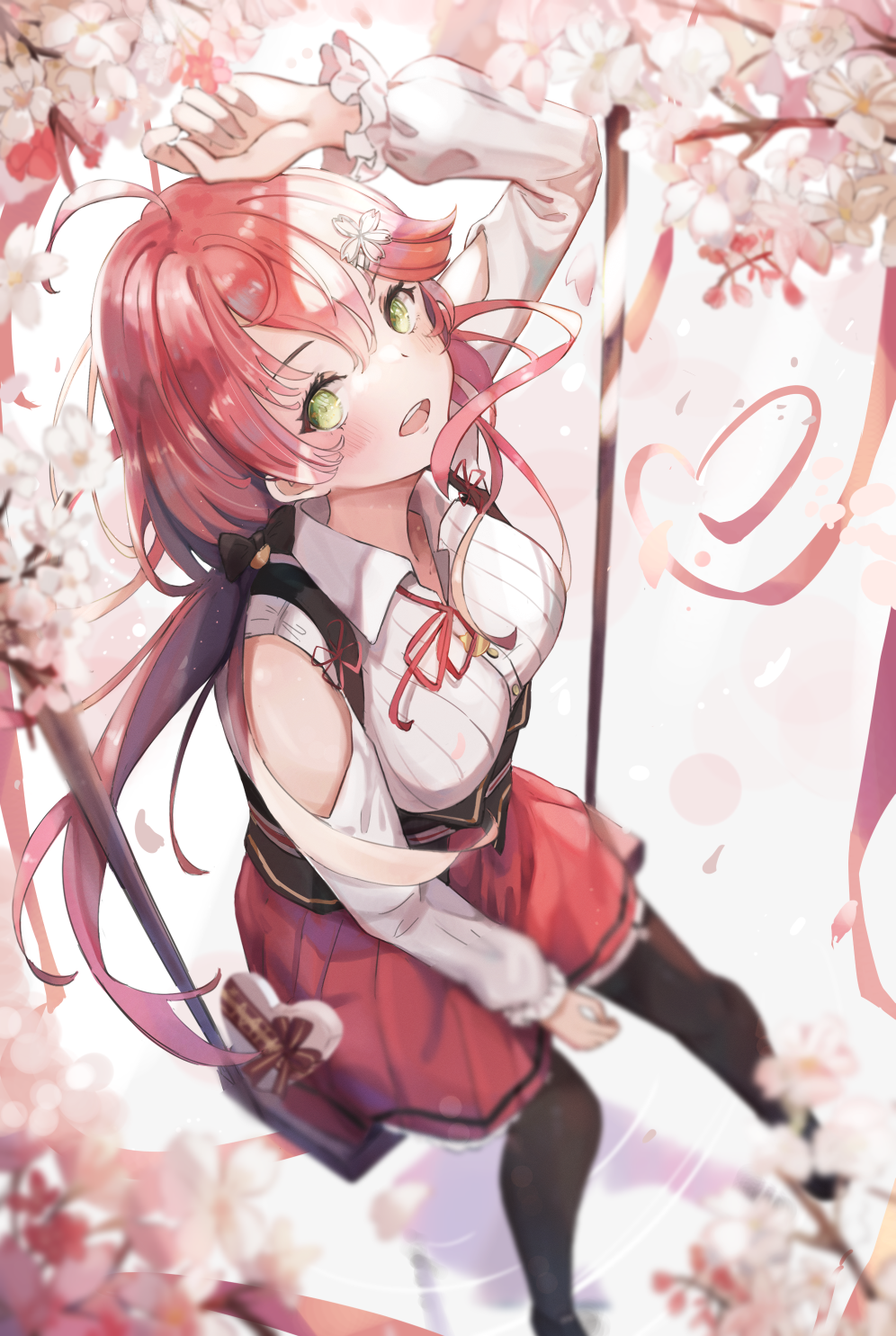 1girl ahoge arm_up black_thighhighs blurry bodice breasts clothing_cutout collared_shirt flower frilled_sleeves frills from_above full_body green_eyes hair_between_eyes highres hololive large_breasts long_hair long_sleeves looking_at_viewer looking_up miakiuehashi neck_ribbon on_swing pink_hair pleated_skirt red_ribbon red_skirt ribbon sakura_miko sakura_miko_(casual) shirt shoulder_cutout sitting skirt solo swing teeth thighhighs twintails upper_teeth_only valentine virtual_youtuber white_shirt