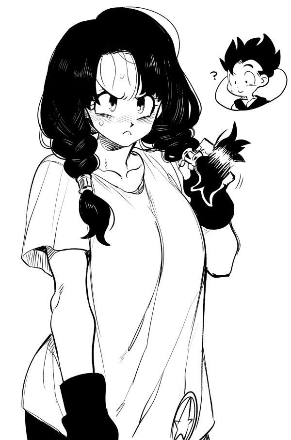 1boy 1girl ? black_hair blush breasts closed_mouth dragon_ball dragonball_z fingerless_gloves gloves holding holding_own_hair long_hair multiple_boys nanika_(nnkgh) shirt shorts simple_background son_gohan spiked_hair sweatdrop twintails videl white_shirt
