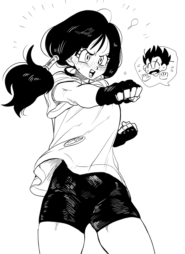 1boy 1girl black_hair blush breasts dragon_ball dragonball_z fingerless_gloves gloves long_hair multiple_boys nanika_(nnkgh) open_mouth shirt shorts simple_background son_gohan speech_bubble spiked_hair sweatdrop teeth twintails videl white_shirt