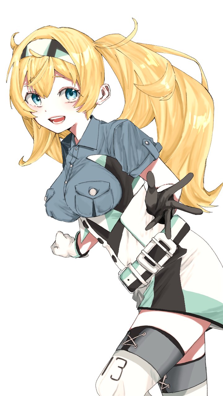 1girl blonde_hair blue_eyes blue_shirt breast_pocket breasts drill_hair gambier_bay_(kancolle) gloves hairband highres kantai_collection long_hair looking_at_viewer medium_breasts multicolored_belt multicolored_gloves multicolored_hairband multicolored_shorts pocket shirt shorts smile solo thighhighs tone_gawa10 twin_drills upper_body white_thighhighs