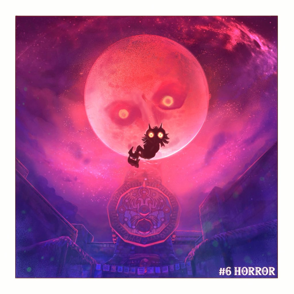 1boy awning banner border city clock clock_tower clock_town cloud floating glowing glowing_eyes looking_at_viewer mask moon_(zelda) night nintendo ora-illustration outdoors silhouette skull_kid sky solo thatched_roof the_legend_of_zelda the_legend_of_zelda:_majora's_mask tower white_border