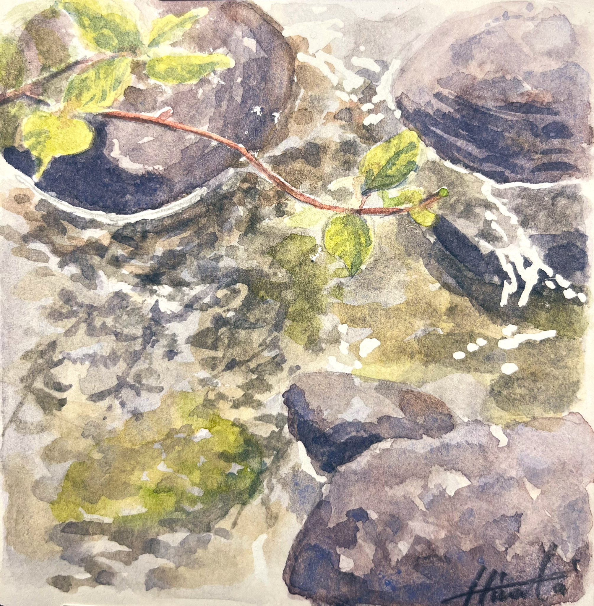 branch day highres hinata_orcat leaf no_humans original painting_(medium) plant plant_focus reflection reflective_liquid rock signature sunlight traditional_media water watercolor_(medium)