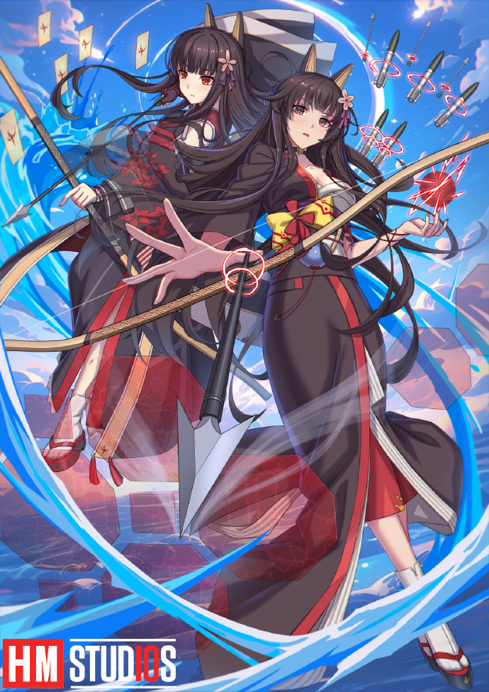 2girls akagi_(warship_girls_r) bandages black_hair black_kimono blunt_bangs bow breasts brown_eyes cleavage dual_persona english_text flower hair_flower hair_ornament japanese_clothes kimono long_hair looking_at_viewer multiple_girls obi ocean sarashi sash sky tabi tiandixingke warship_girls_r weapon wide_sleeves