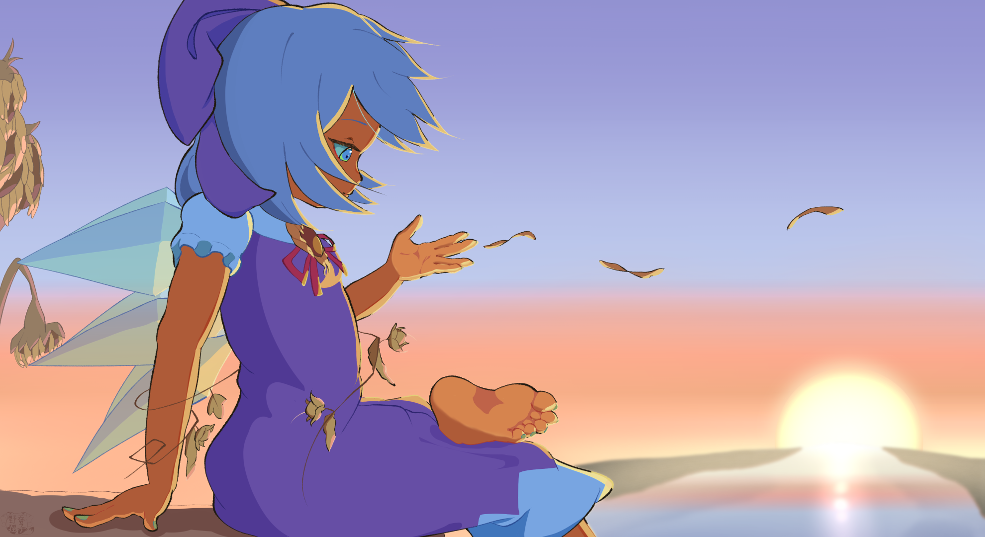 1girl backlighting barefoot blue_dress blue_eyes blue_hair cirno crossed_legs dress feet flower gradient_sky half-closed_eyes highres himeko_nodanuki horizon ice ice_wings leaf medium_hair plant puffy_short_sleeves puffy_sleeves short_sleeves sitting sky soles solo sun sunflower sunset tan tanned_cirno toes touhou vines wilted_flower wind wings