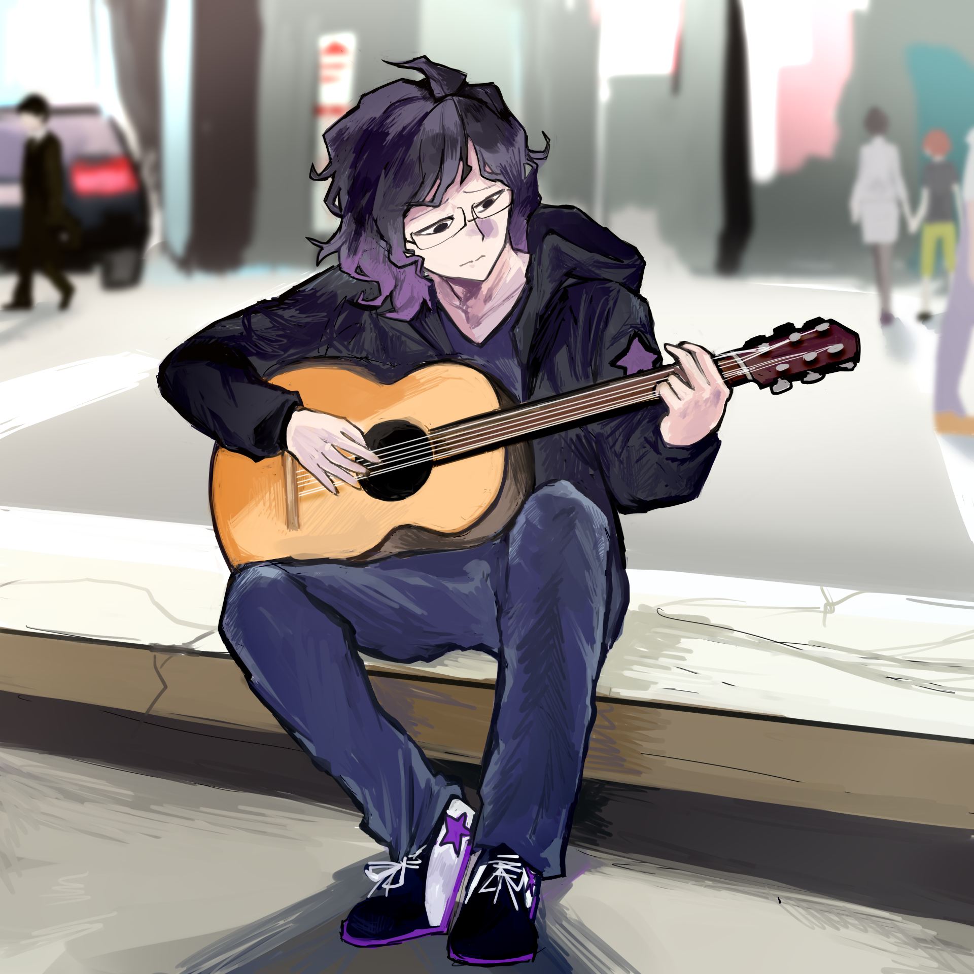 aiba_takumi aiba_yukino black_eyes black_hair digimon digimon_story:_cyber_sleuth guitar highres instrument jimmy_ken makeup_removed medium_hair sitting