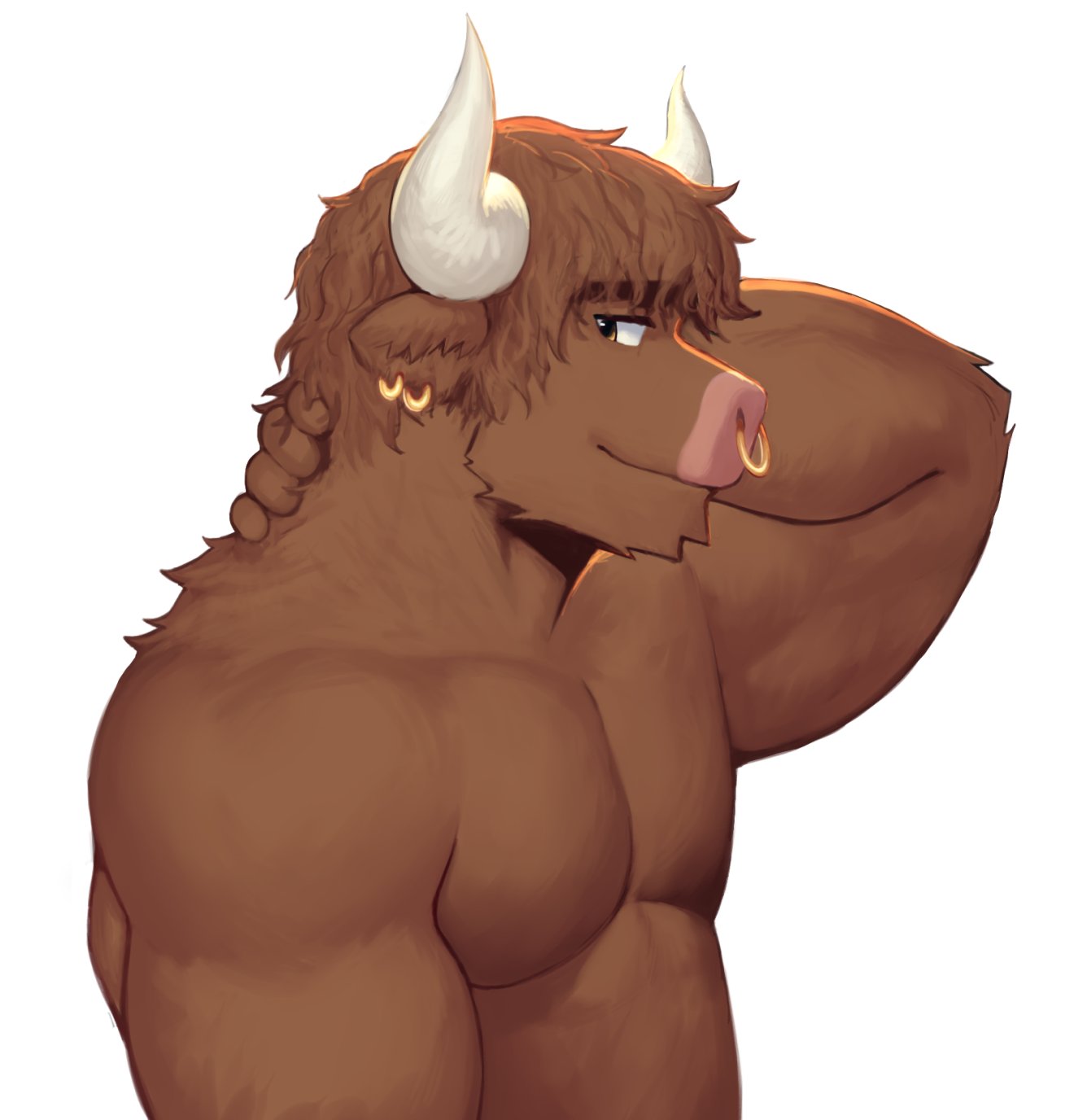 1boy animal_ears bara brown_eyes closed_mouth commentary cow_boy cow_ears cow_horns earrings english_commentary face_piercing furry furry_male highres horns jewelry looking_at_viewer male_focus nose_piercing nose_ring original piercing profile ring_piercing smile topless_male upper_body white_background yass_pill