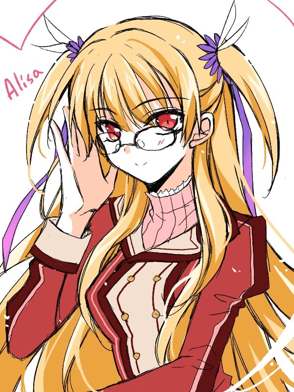 1girl alisa_reinford alternate_hairstyle asti2 bespectacled blonde_hair breasts closed_mouth commentary_request eiyuu_densetsu glasses hair_ribbon long_hair looking_at_viewer purple_ribbon red_eyes ribbon sen_no_kiseki_(series) sen_no_kiseki_i simple_background smile solo thors_military_academy_class_vii_uniform two_side_up upper_body white_background