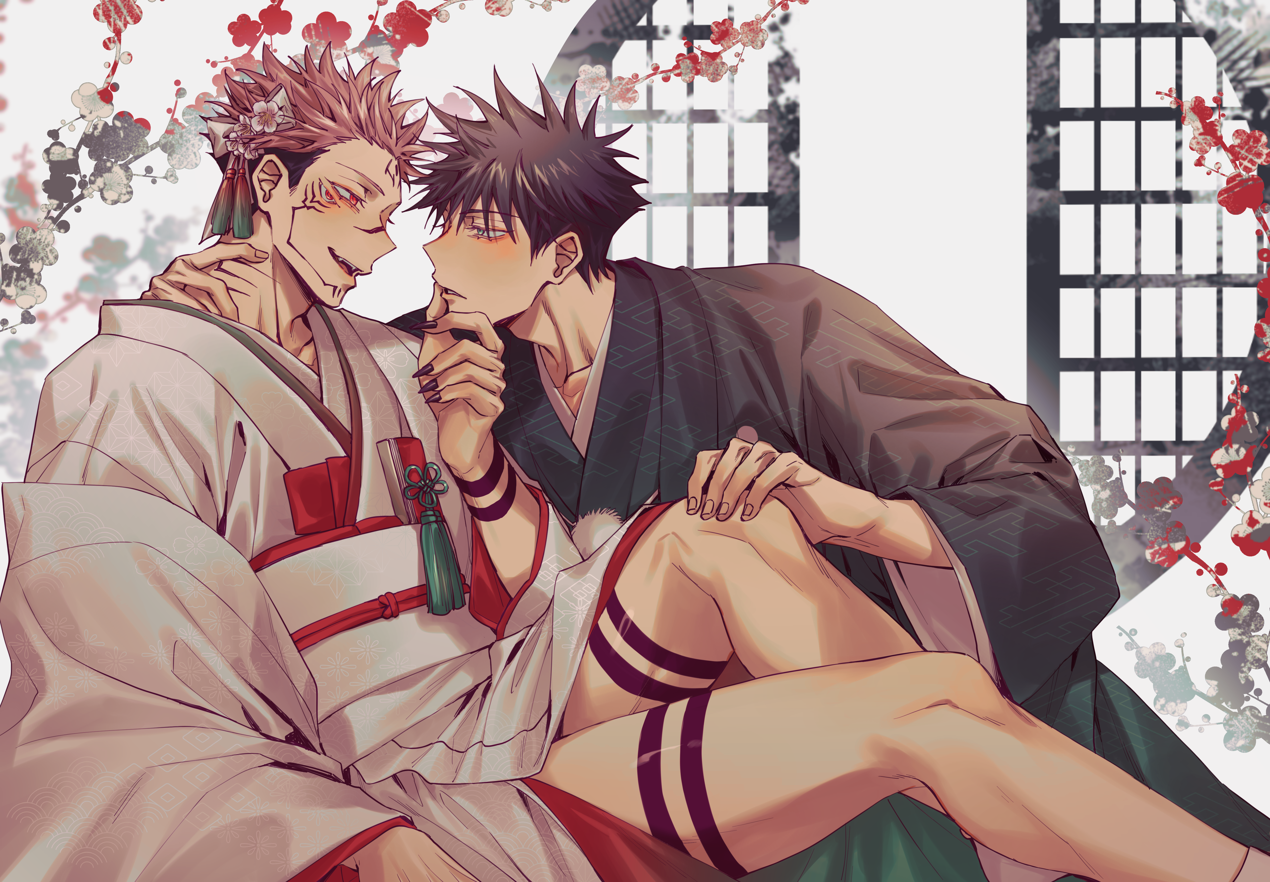 2boys absurdres azukiharuta_ju black_hair black_nails black_robe blush extra_eyes eye_contact facial_tattoo feet_out_of_frame fingernails flower four_eyes fushiguro_megumi green_eyes hair_flower hair_ornament hand_on_another's_chin hand_on_another's_face hand_on_another's_knee highres jujutsu_kaisen leg_tattoo long_sleeves looking_at_another male_focus multiple_boys neck_tattoo open_mouth parted_lips pink_hair red_eyes robe ryoumen_sukuna_(jujutsu_kaisen) sharp_fingernails short_hair smile tattoo teeth undercut white_robe yaoi