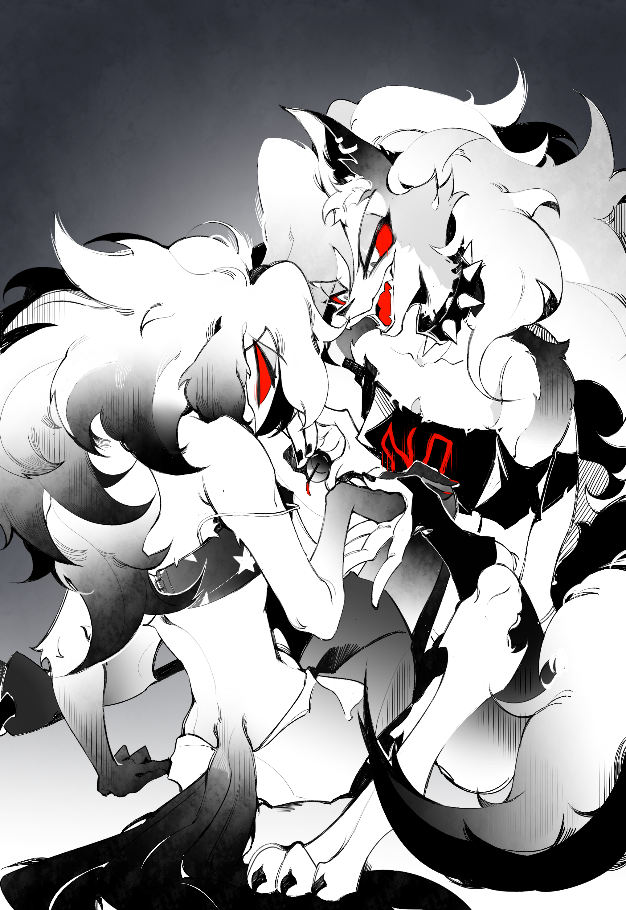 2girls absurdres animal_ears demon_girl dog_ears dog_girl dog_tail furry furry_female hellaverse helluva_boss highres loona_(helluva_boss) multiple_girls nail_polish octavia_(helluva_boss) owl_girl red_eyes sharp_teeth tail teeth zhu_xing_pupupu