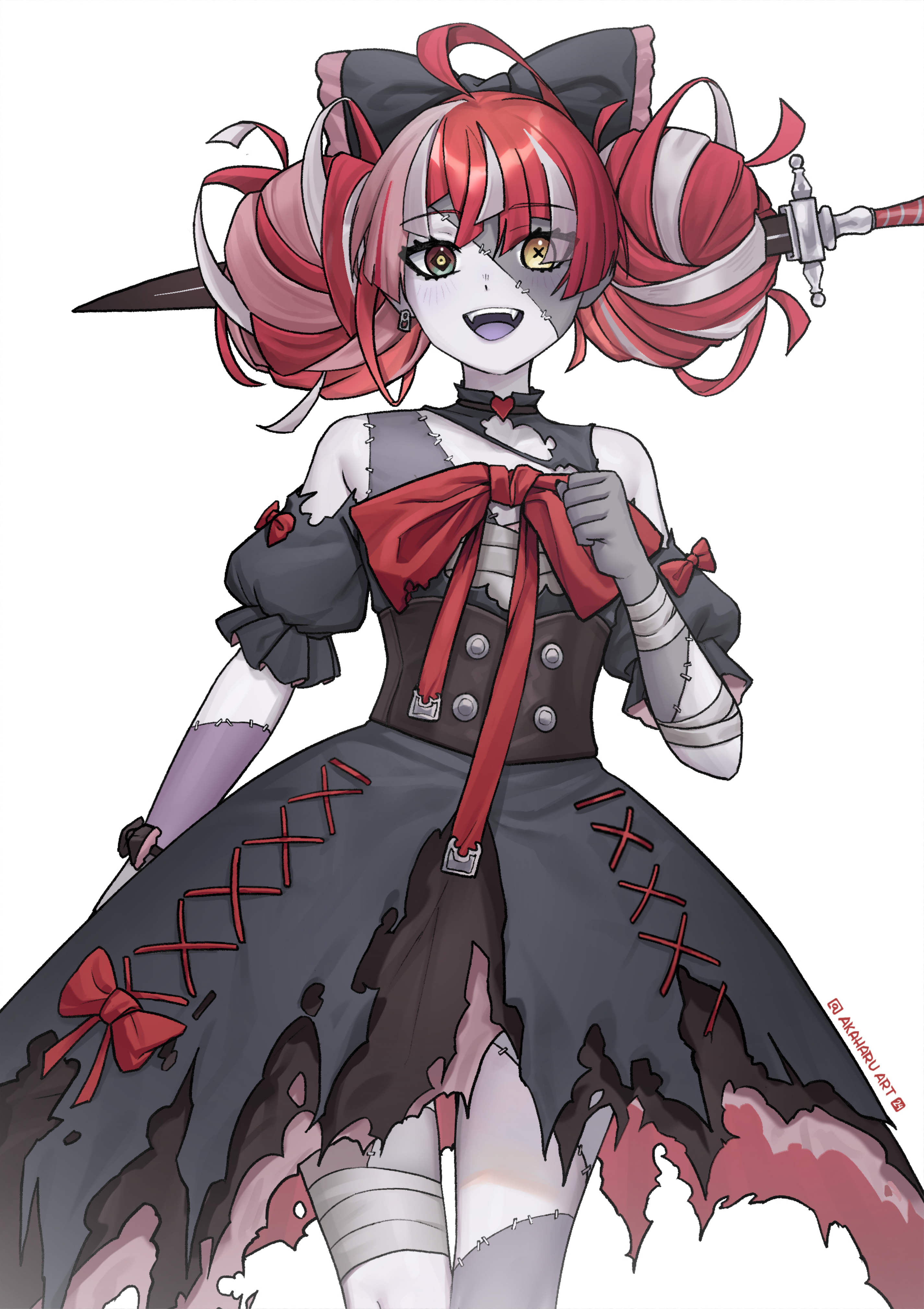 1girl absurdres ahoge akaharuu bandaged_arm bandaged_leg bandages bare_shoulders black_bow black_corset black_dress blunt_ends bow colored_skin colored_tongue corset cowboy_shot diamond-shaped_pupils diamond_(shape) double_bun dress earrings fangs frilled_bow frills gradient_eyes green_eyes hair_bow hair_bun heterochromia highres hololive hololive_indonesia impaled jewelry kureiji_ollie kureiji_ollie_(1st_costume) layered_dress mismatched_pupils multicolored_eyes multicolored_hair open_mouth puffy_short_sleeves puffy_sleeves purple_tongue red_bow red_eyes red_hair sarashi short_sleeves solo standing stitched_arm stitched_face stitched_leg stitched_torso stitches sword symbol-shaped_pupils teeth torn_clothes torn_dress underbust upper_teeth_only virtual_youtuber weapon white_background white_hair white_skin wrist_bow x-shaped_pupils yellow_eyes
