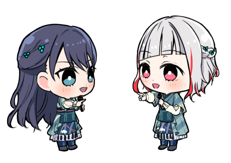 2girls blue_eyes blue_hair braid chibi chibi_only colored_inner_hair commentary_request dark_blue_hair diagonal_bangs dollchestra green_kimono grey_hair half_up_braid half_updo japanese_clothes kimono layered_sleeves link!_like!_love_live! long_hair long_sleeves love_live! lowres multicolored_hair multiple_girls murano_sayaka official_alternate_costume official_alternate_hairstyle pink_eyes pointing pointing_at_another red_hair short_hair short_over_long_sleeves short_sleeves simple_background streaked_hair suito take_it_over_(love_live!) virtual_youtuber white_background yugiri_tsuzuri