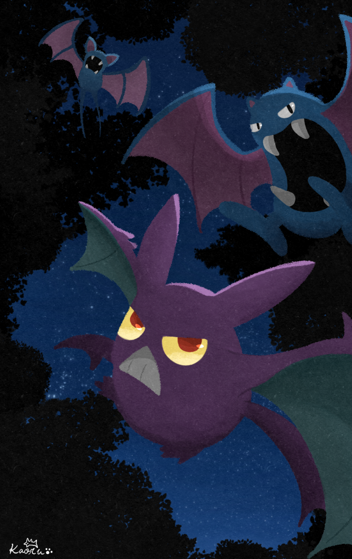 bat_(animal) black_eyes colored_sclera crobat evolutionary_line fangs flying gen_1_pokemon gen_2_pokemon golbat multiple_wings night nintendo open_mouth pokemon pokemon_(creature) red_eyes tree wings yellow_sclera zubat