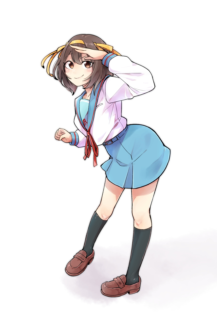 1girl black_socks blue_sailor_collar blue_skirt brown_eyes brown_hair brown_shoes closed_mouth commentary_request full_body hair_ribbon hairband highres kita_high_school_uniform kneehighs loafers long_sleeves looking_at_viewer medium_hair moccochi red_ribbon ribbon sailor_collar school_uniform serafuku shoes skirt smile socks solo standing suzumiya_haruhi suzumiya_haruhi_no_yuuutsu winter_uniform yellow_hairband yellow_ribbon