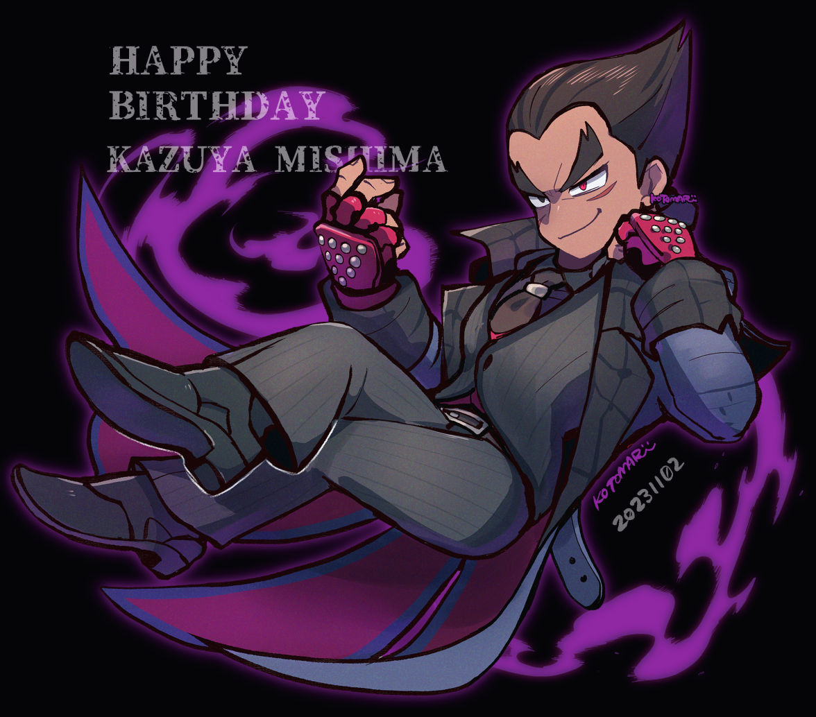 1boy beckoning belt black_background black_eyes black_footwear black_hair black_jacket black_necktie black_pants blue_coat character_name closed_mouth coat crossed_legs dated facial_scar fingernails fire floating gloves happy_birthday jacket kotomaru_(kotokoto_kottan) long_sleeves male_focus mishima_kazuya necktie pants purple_fire red_eyes red_gloves scar scar_on_cheek scar_on_face signature smile solo studded_gloves tekken v-shaped_eyebrows