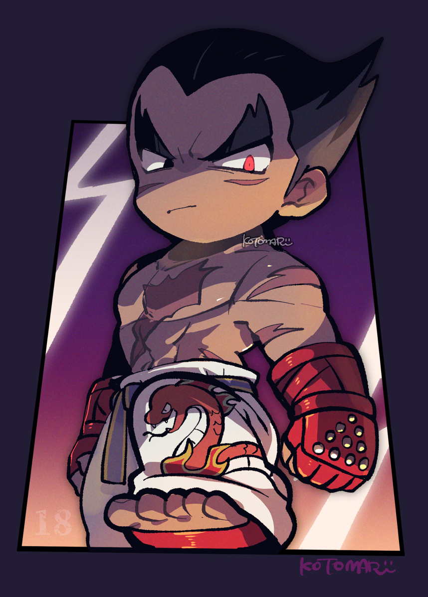 1boy arms_at_sides belt black_eyes black_hair border closed_mouth collarbone facial_scar from_below gloves kotomaru_(kotokoto_kottan) looking_at_viewer male_focus martial_arts_belt mishima_kazuya navel no_nose pants pectorals purple_belt purple_border red_eyes red_gloves scar scar_on_arm scar_on_cheek scar_on_chest scar_on_face signature snake_print solo stepping studded_gloves tekken thick_eyebrows topless_male v-shaped_eyebrows white_pants