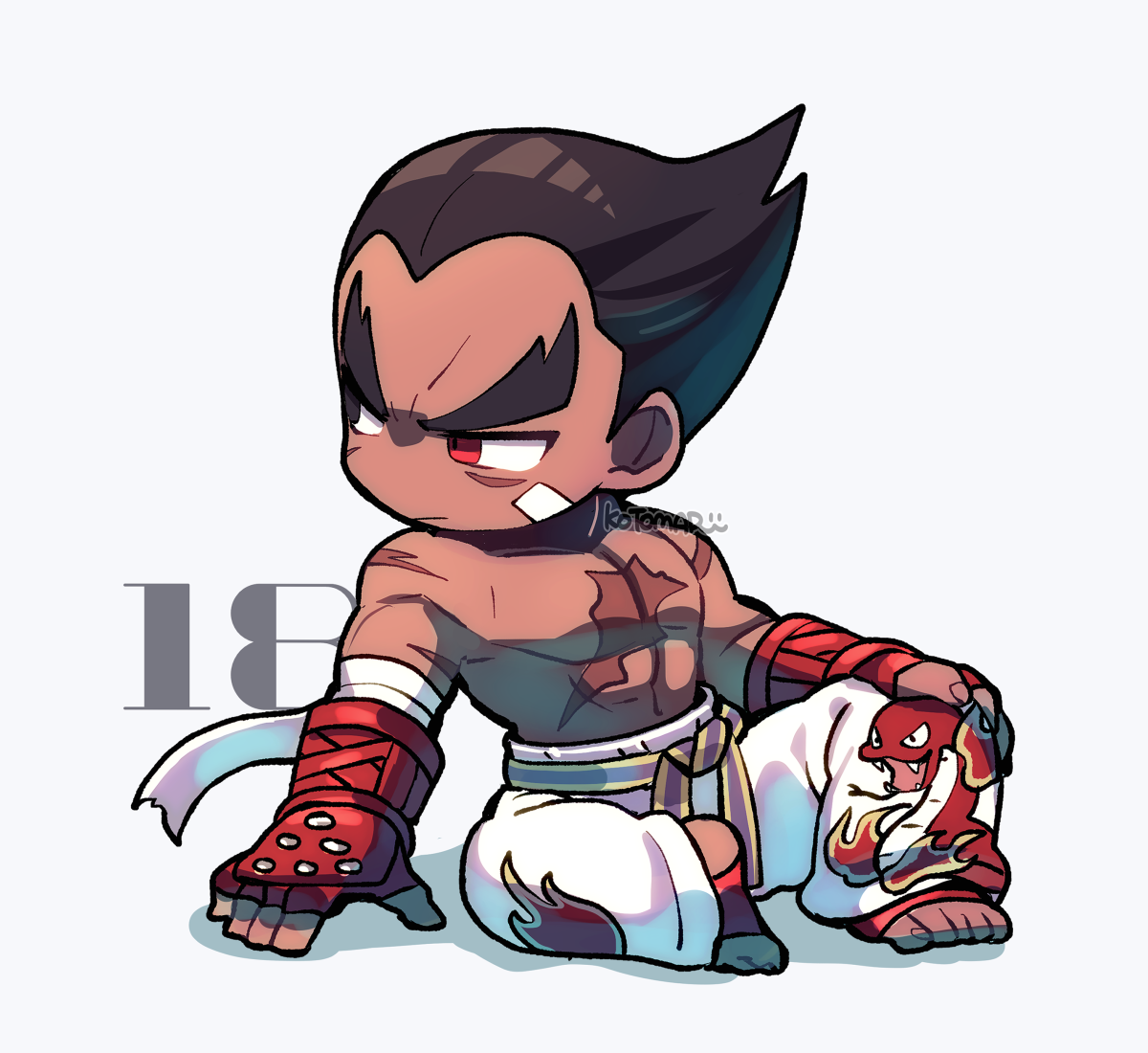 1boy abs arm_support bandage_on_face bandages belt black_eyes black_hair closed_mouth gloves hand_on_own_knee heterochromia kotomaru_(kotokoto_kottan) looking_to_the_side male_focus martial_arts_belt mishima_kazuya no_nose pants pectorals purple_belt red_eyes red_gloves scar scar_on_arm scar_on_chest short_hair sideburns signature sitting solo studded_gloves tekken thick_eyebrows topless_male v_arms white_background white_pants