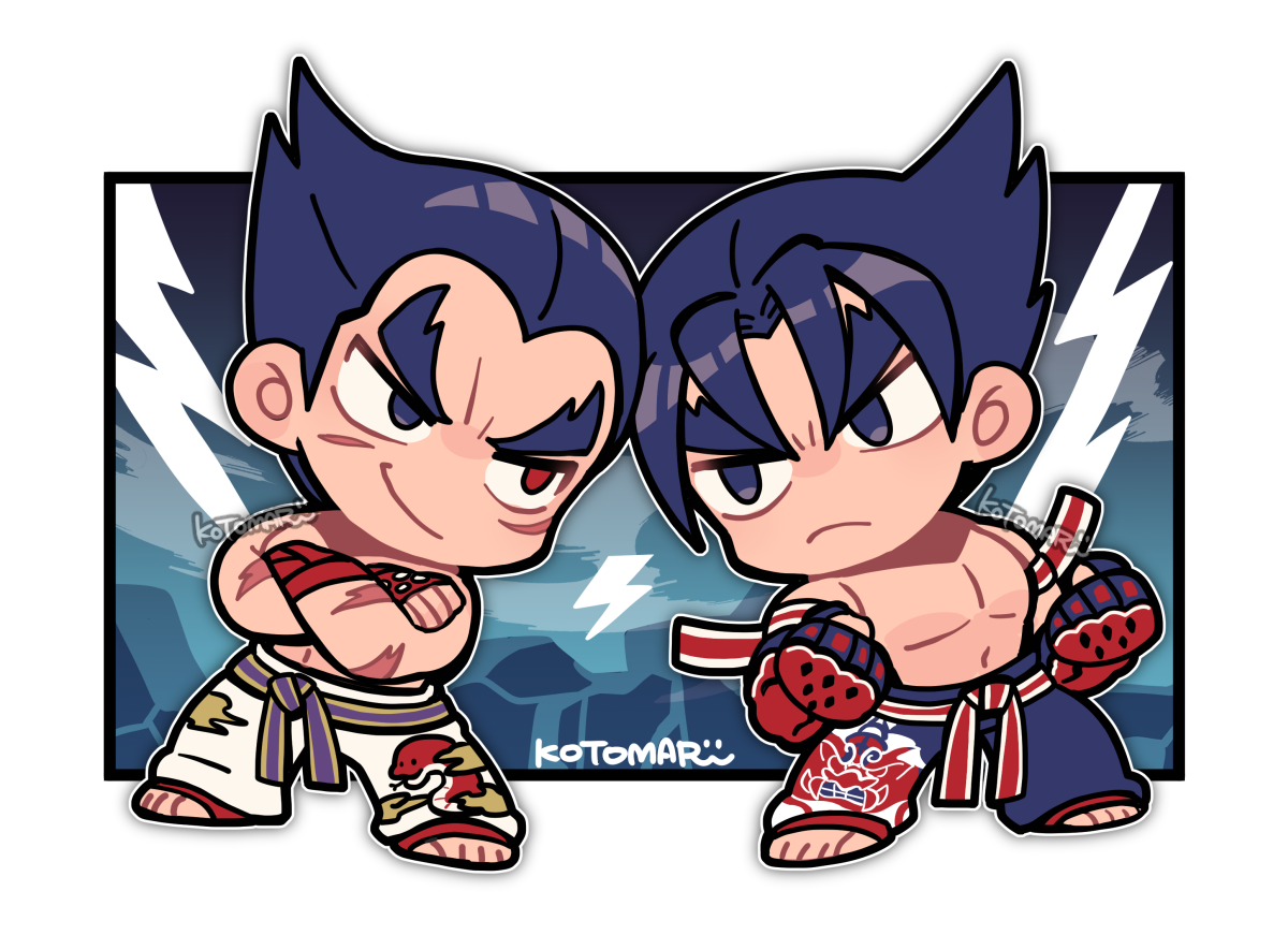 2boys belt black_eyes black_hair chibi clenched_hands closed_mouth crossed_arms eye_contact facial_scar father_and_child father_and_son fingerless_gloves frown full_body gloves heterochromia kazama_jin kotomaru_(kotokoto_kottan) looking_at_another male_focus martial_arts_belt mishima_kazuya multiple_boys navel no_nose pants parent_and_child pectorals purple_belt red_belt red_eyes red_gloves scar scar_on_arm scar_on_cheek scar_on_face smile snake_print standing studded_gloves tekken thick_eyebrows topless_male v-shaped_eyebrows white_pants